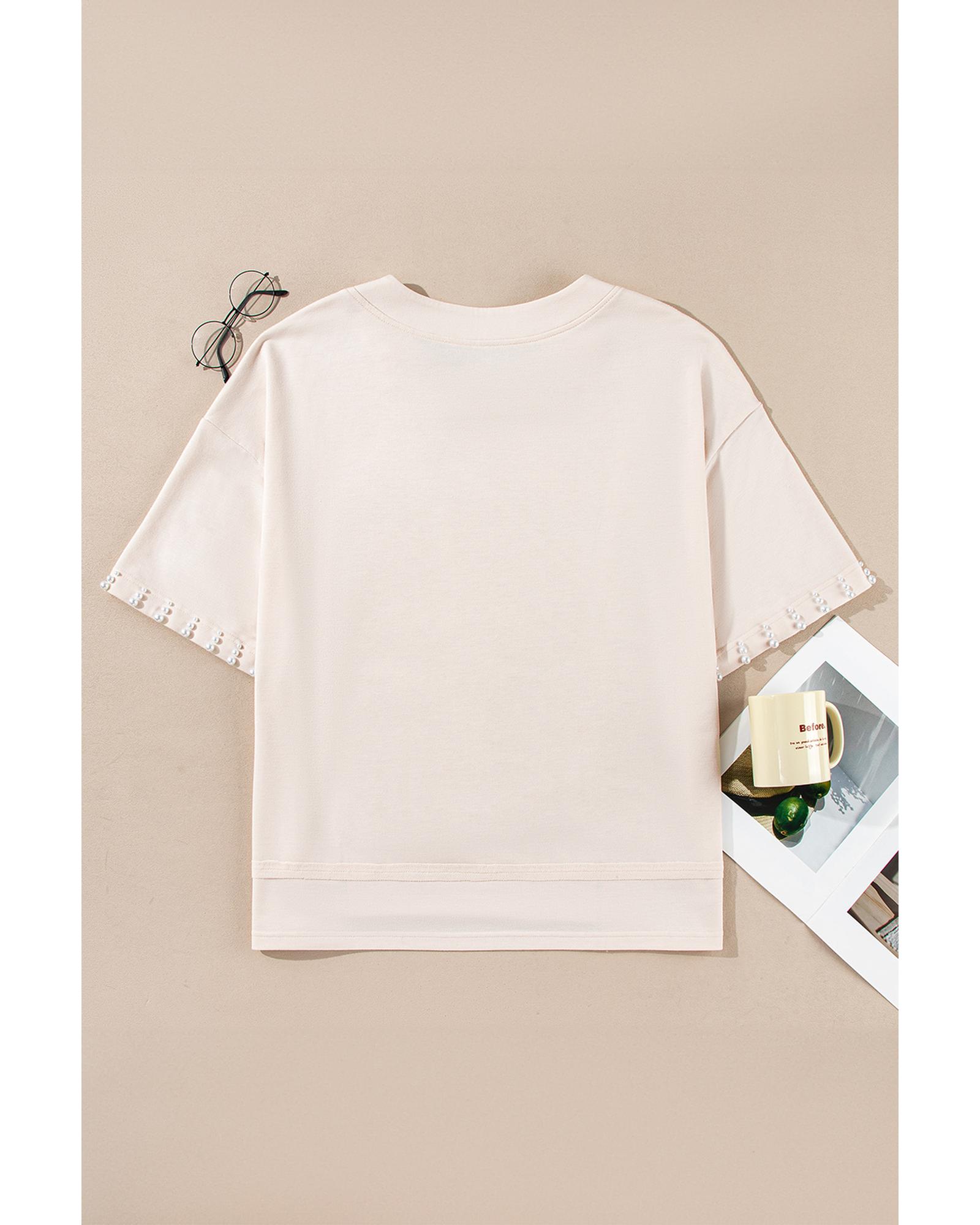 This beige pearl decor crew neck T-shirt features a stylish and comfortable design suitable for various casual occasions. It combines a trendy fitted look with practical details, making it a versatile addition to your wardrobe.