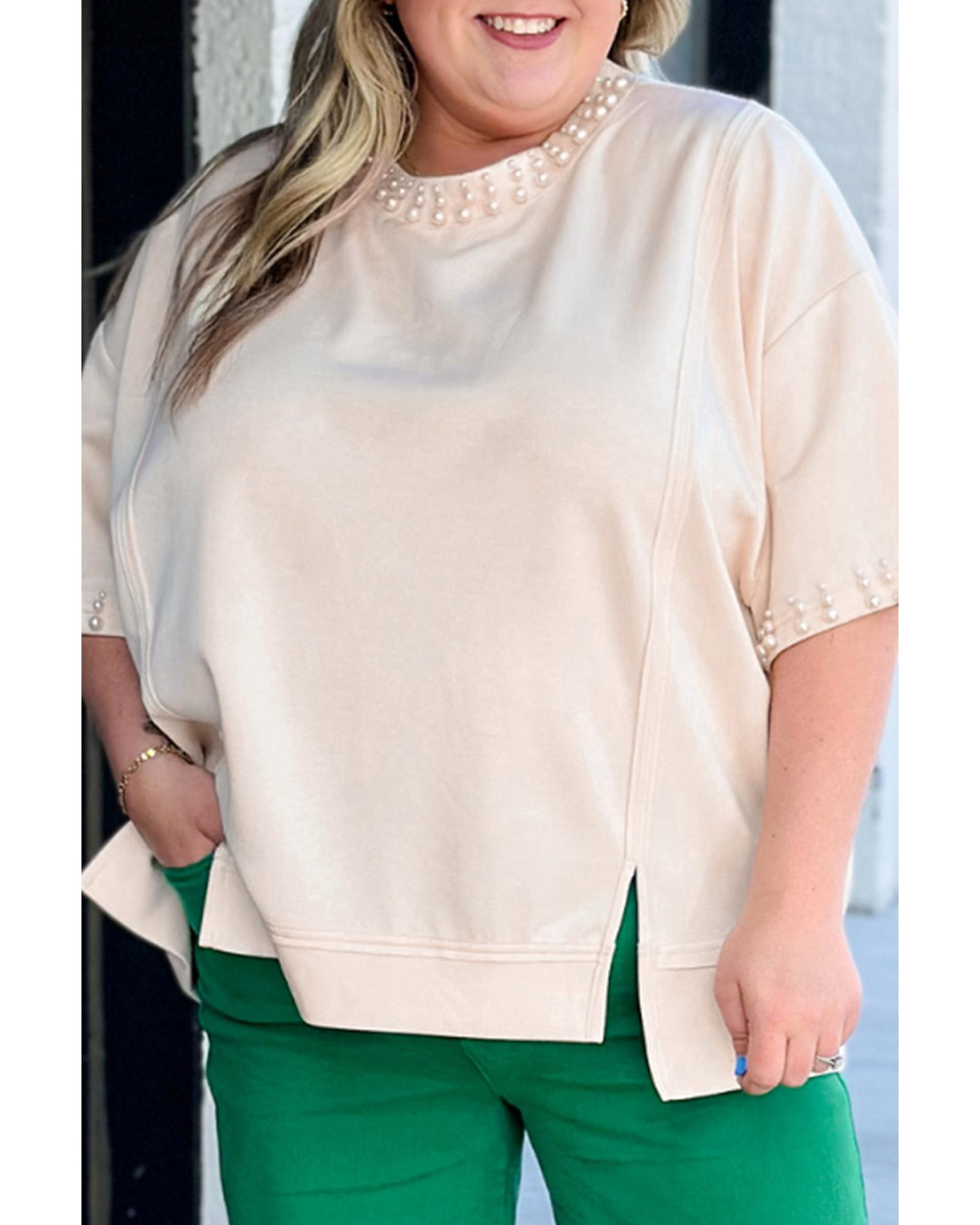 Beige Pearl Decor Crew Neck Half Sleeve Plus Size T Shirt – 1X