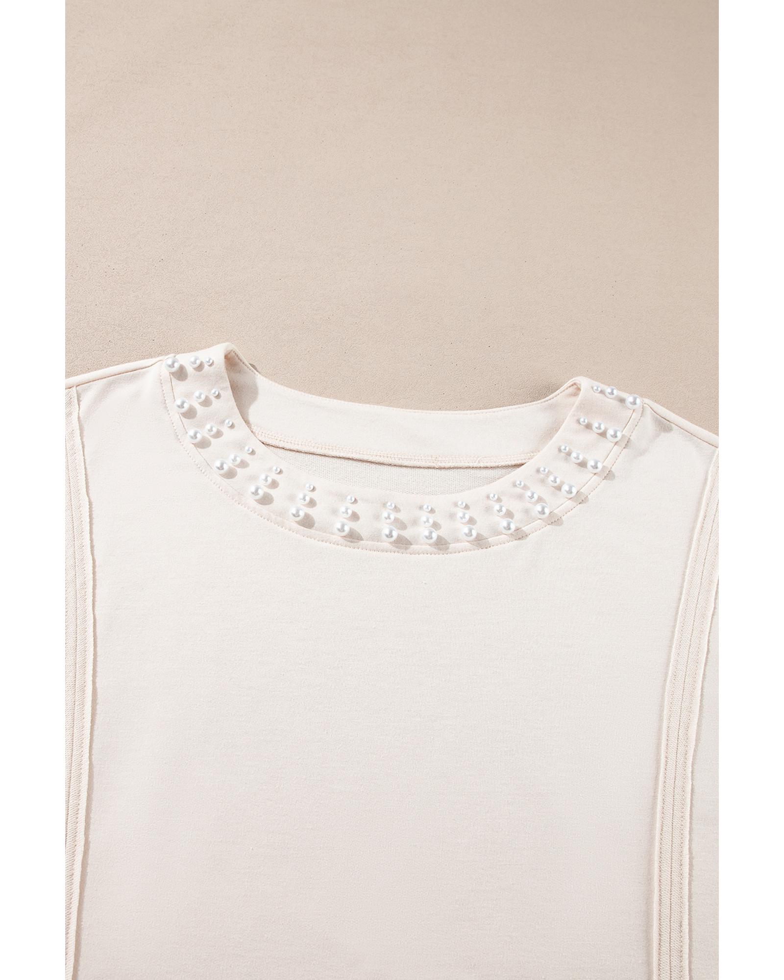 - Package includes: 1 beige pearl decor crew neck T-shirt