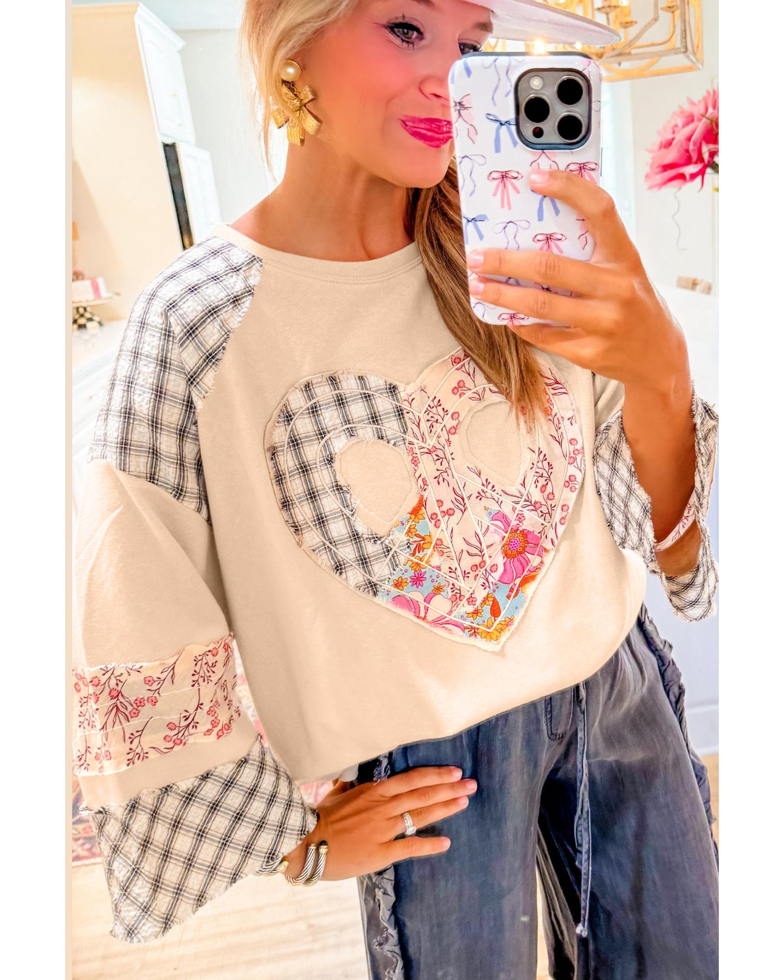 This stylish top features a unique beige plaid floral peace heart graphic design, perfect for those looking to make a fashion statement while enjoying comfort. With wide long sleeves and a trendy oversized fit, it is ideal for casual wear.