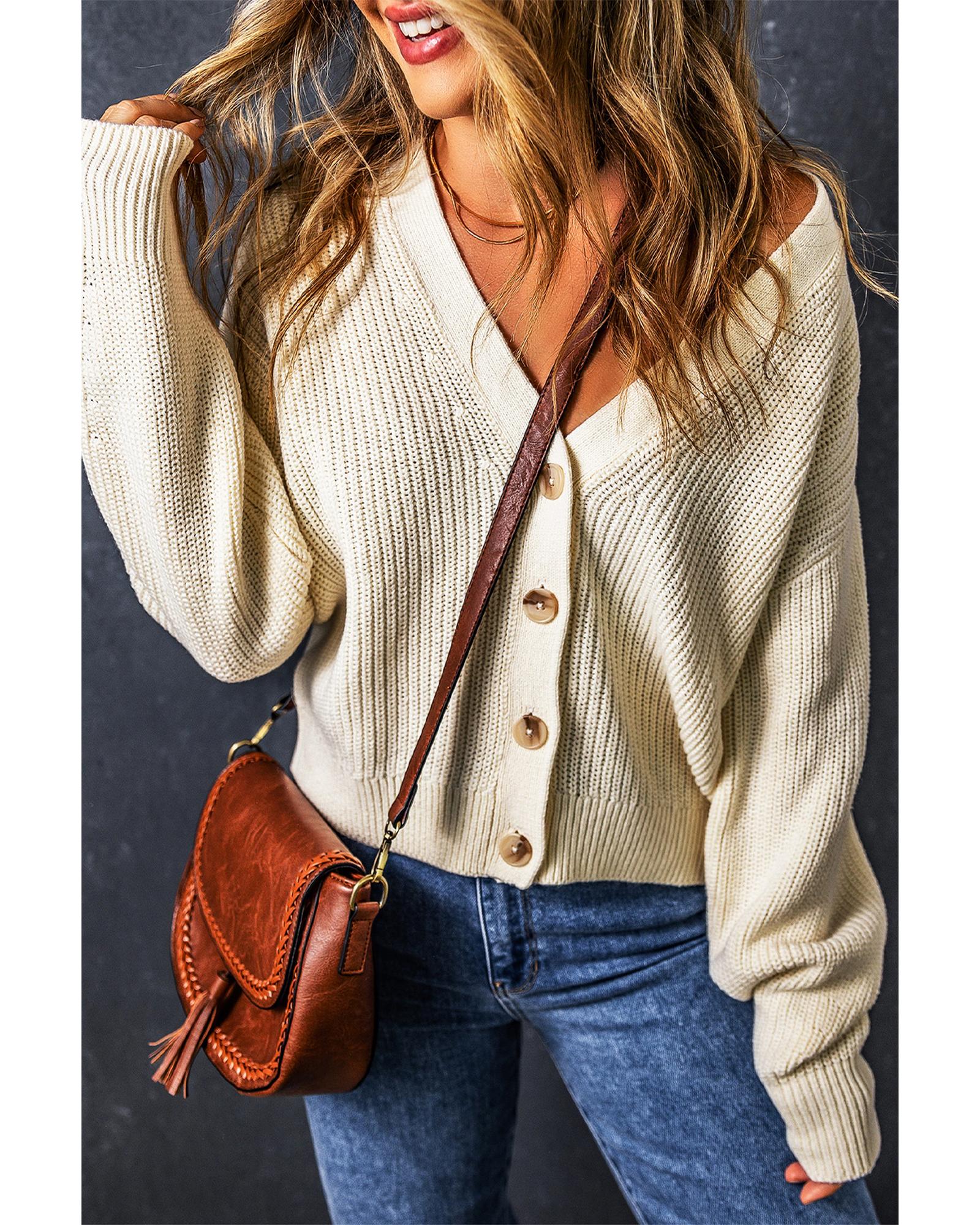 This beige plain knitted cardigan features a classic buttoned V-neck design, offering a versatile and timeless addition to your wardrobe. Crafted from high-quality materials, it provides both comfort and durability, making it suitable for various occasions. The button-up style ensures easy wear and a stylish look.