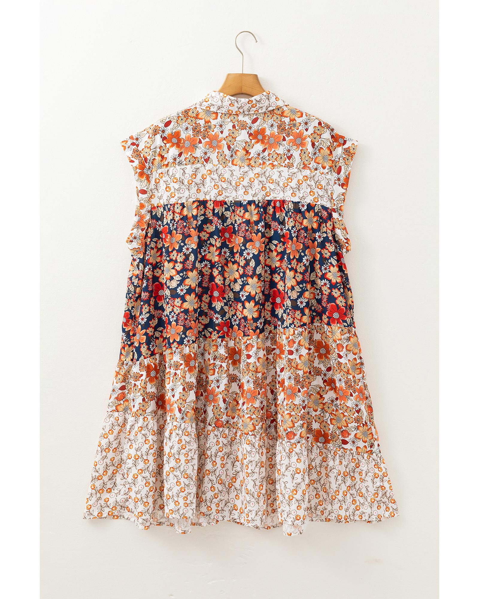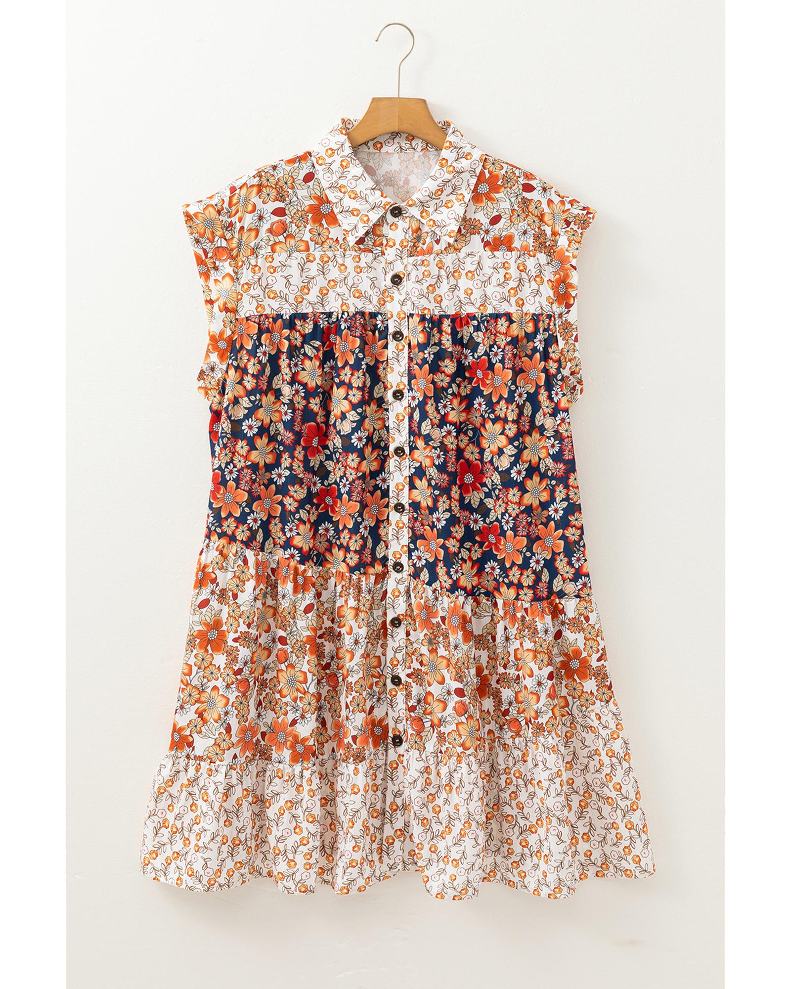 This beige plus size mini dress features a sleeveless design with a flattering fit, perfect for various occasions. The dress showcases a vibrant floral patchwork pattern and a classic collared neckline, combined with a functional button front closure for ease of wear.