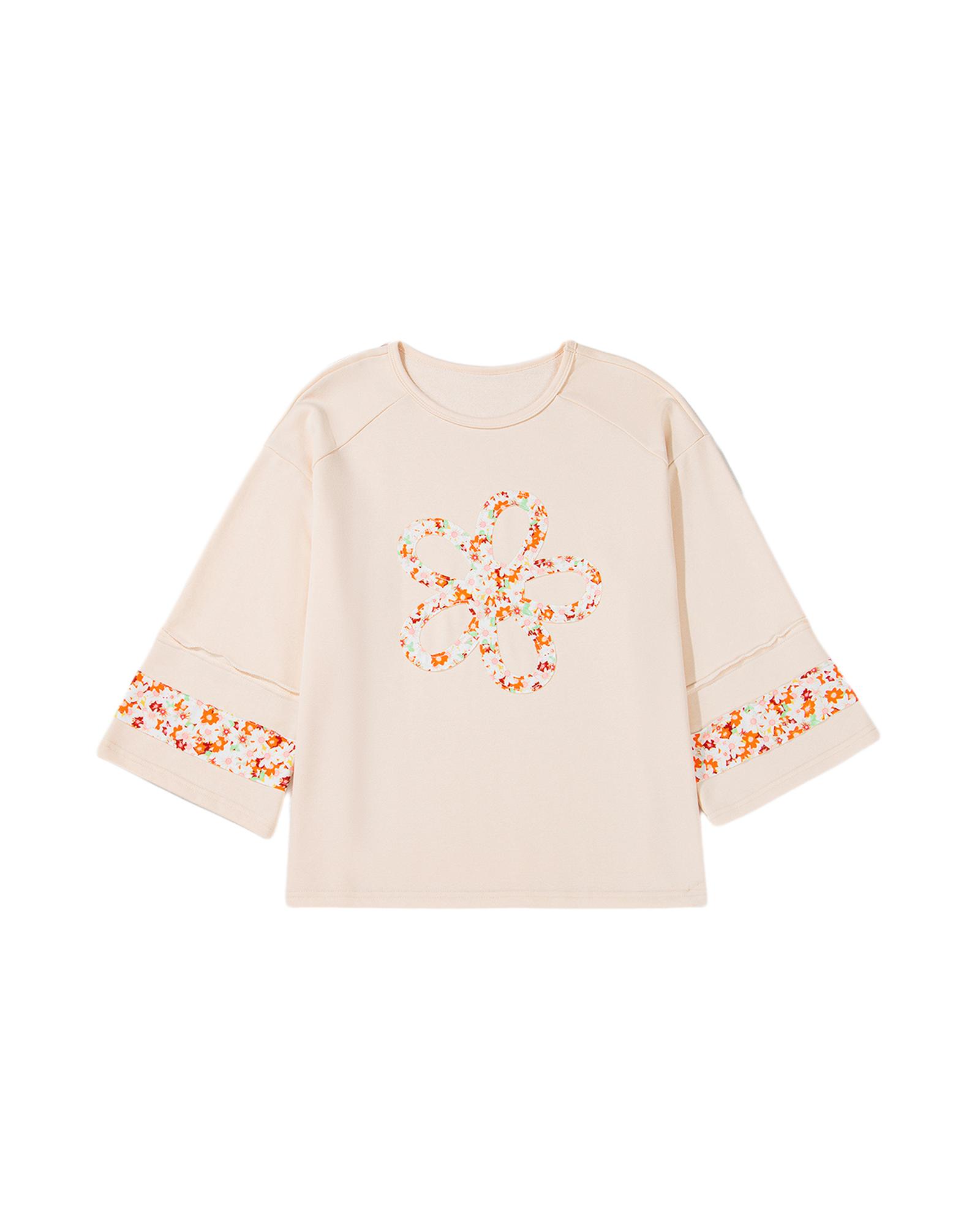 Beige Plus Size Flower Patched Side Slits Crewneck Top – 2X