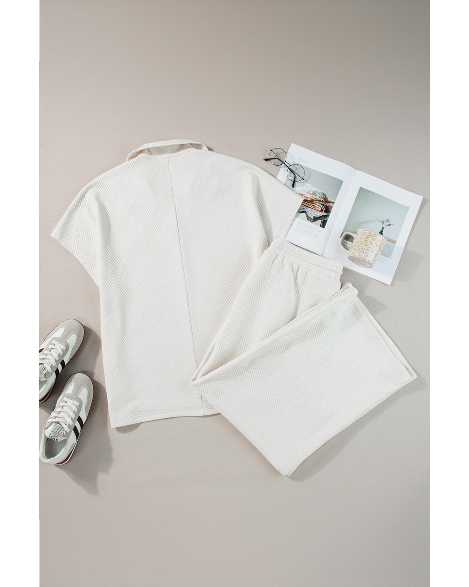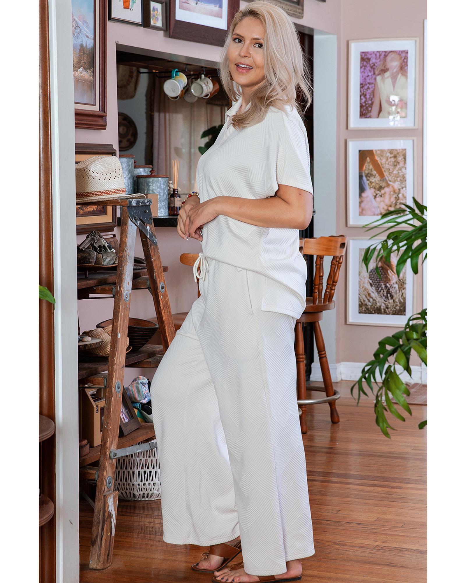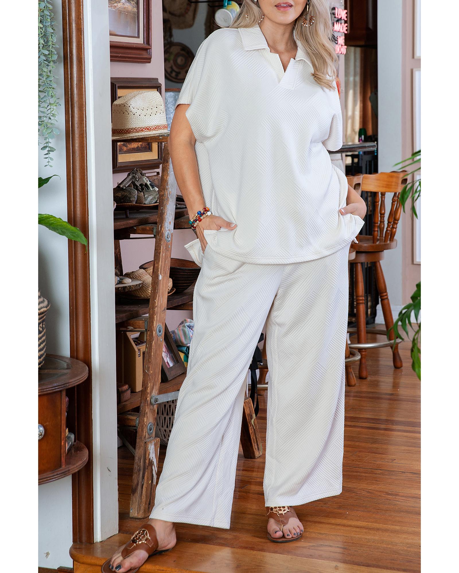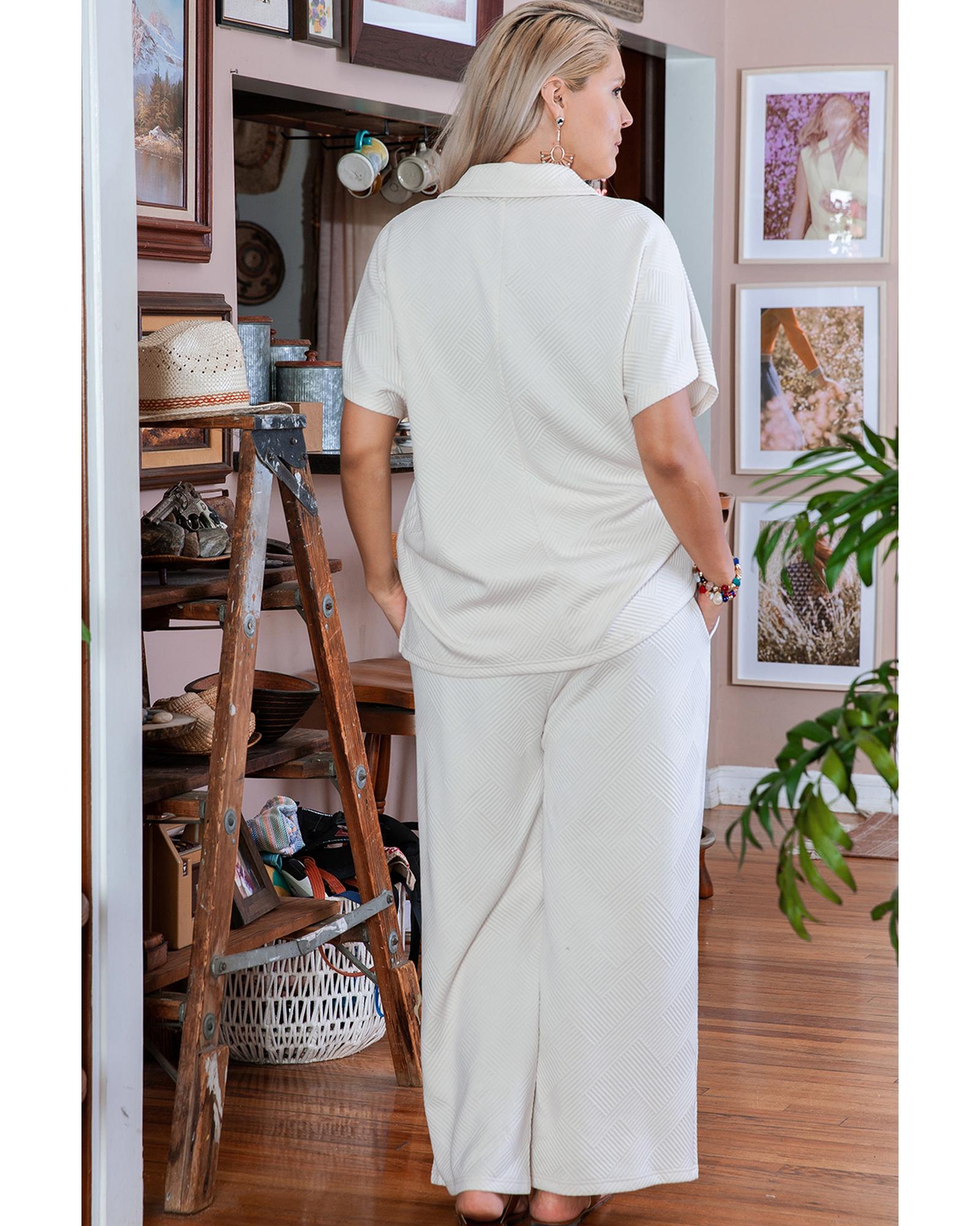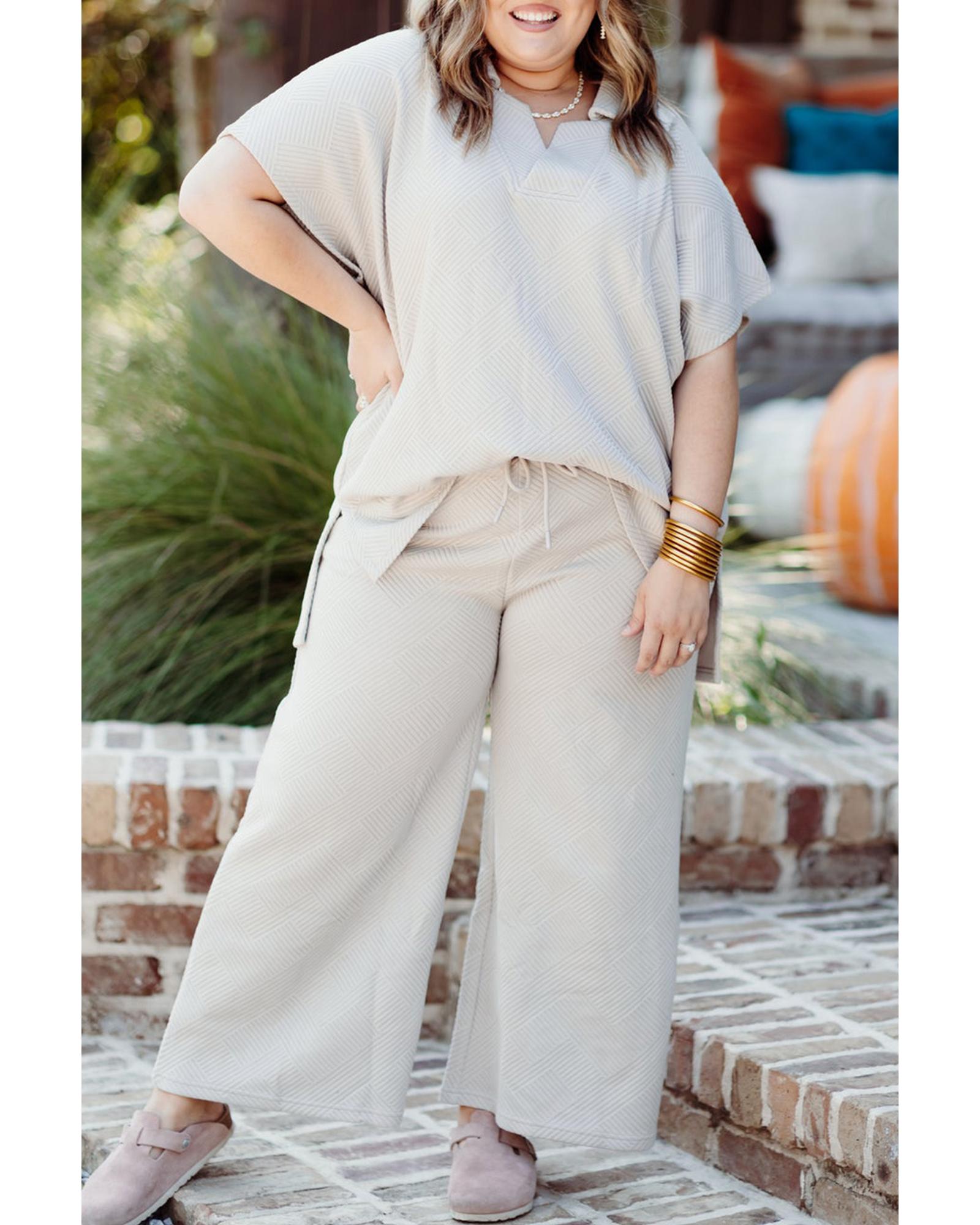 Beige Plus Size Textured Collared Top and Pants Set – 2X