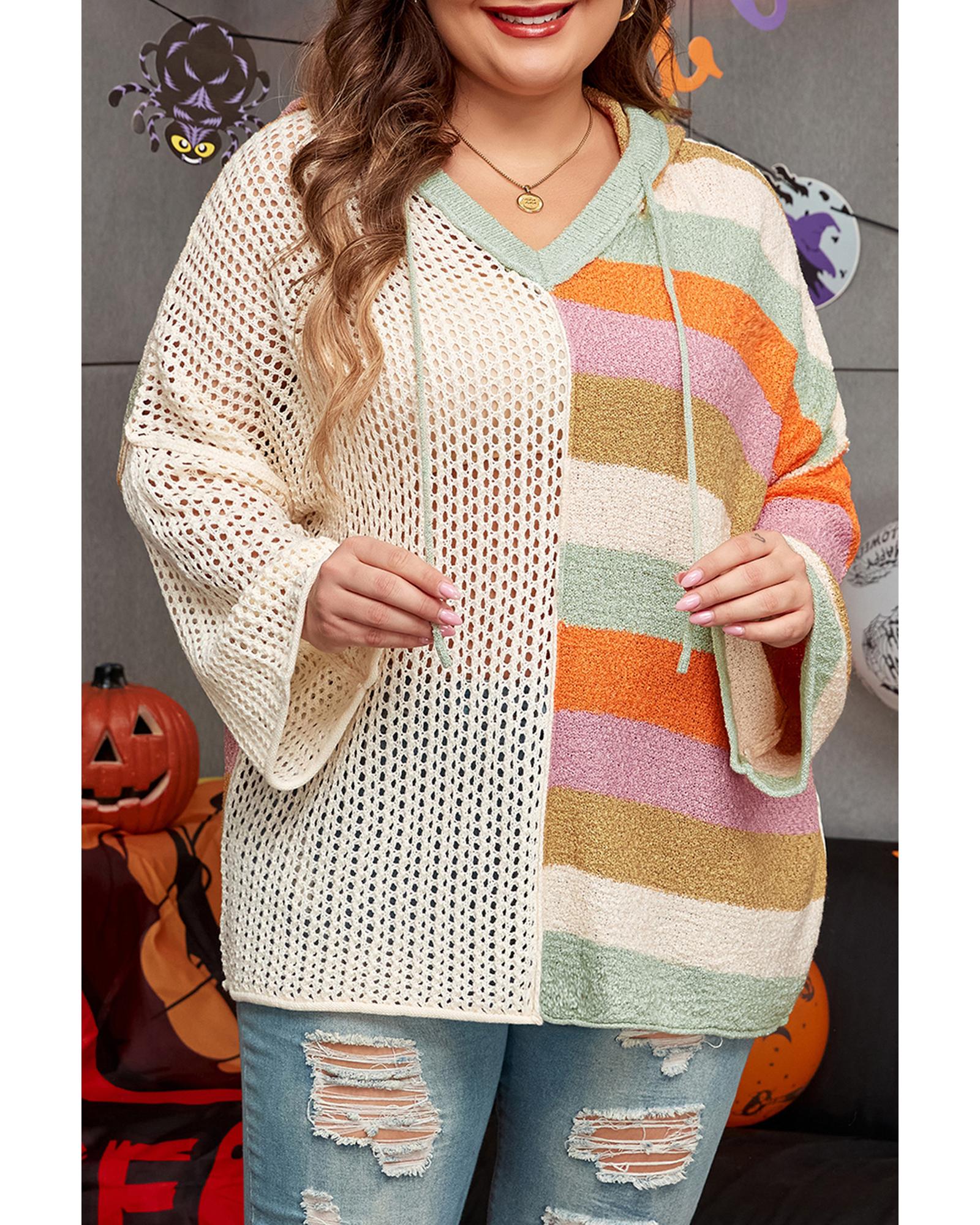 Beige Pointelle Knit Colorblock Patchwork V Neck Hooded Plus Sweater – 1X
