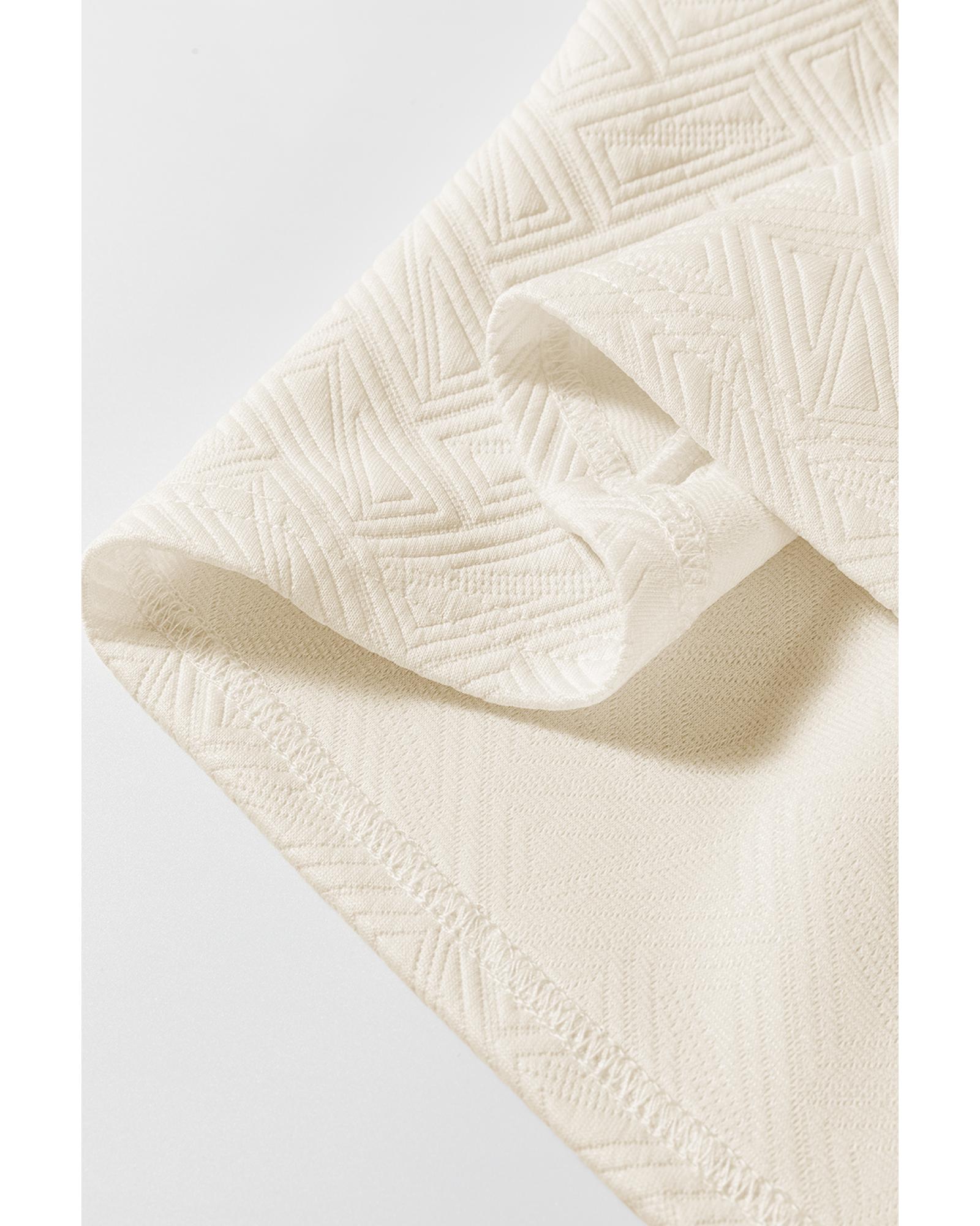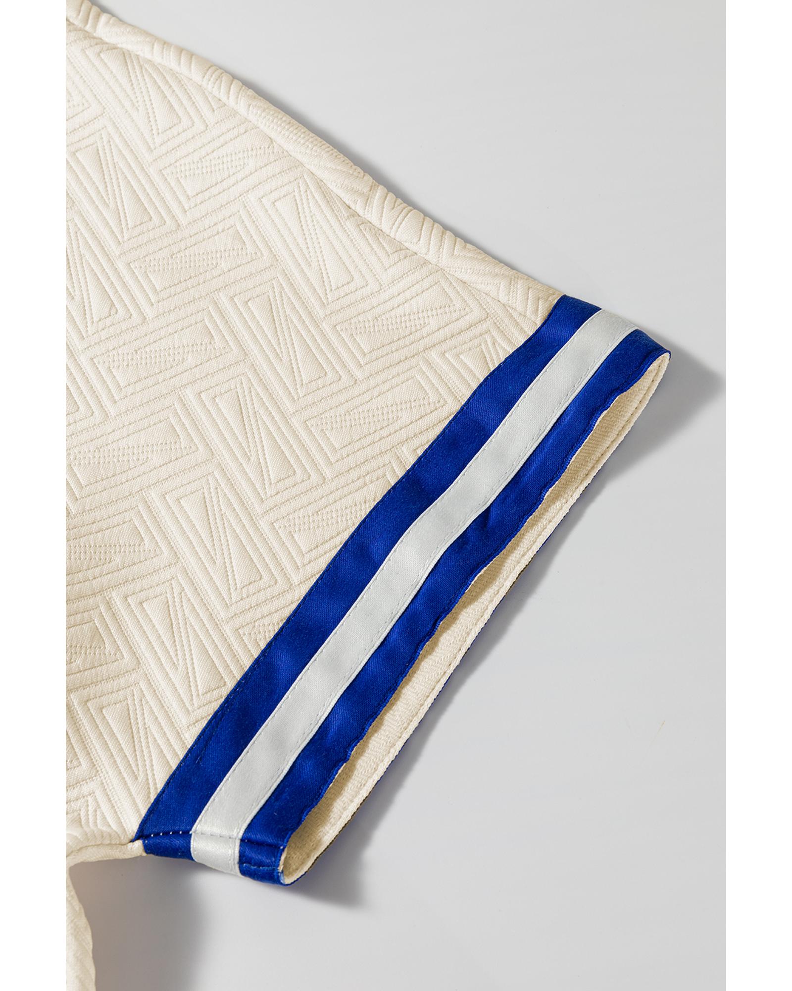 Beige Preppy Striped Trim Textured Quarter Zipper Colorblock Short Sleeve Top – L