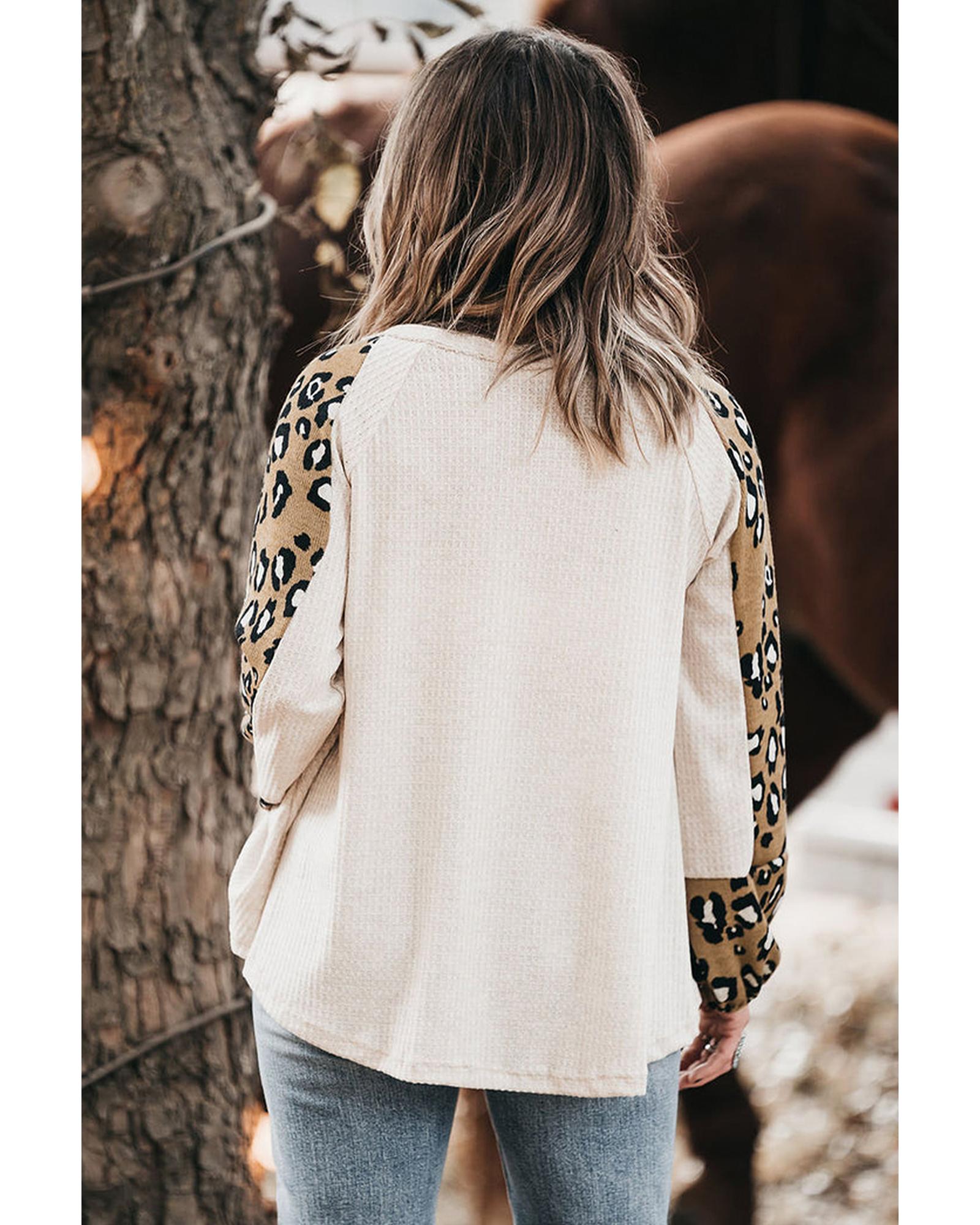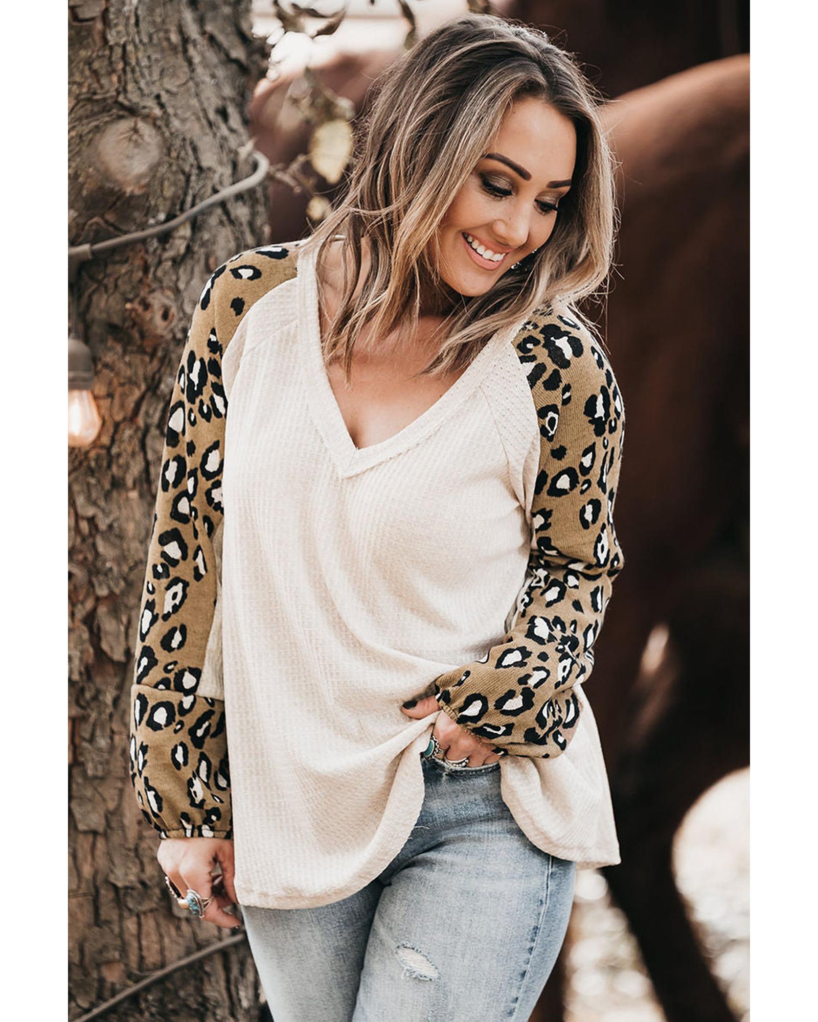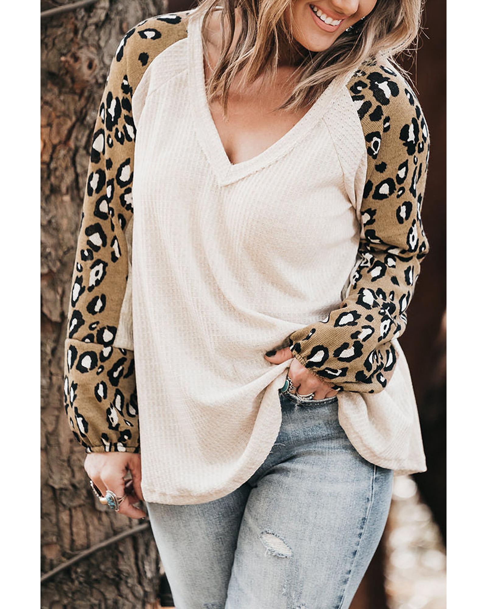 This beige printed plus size long sleeve top features a stylish contrast leopard print design on the sleeves, crafted from soft waffle knit fabric for a comfortable fit. Designed for women, it offers a trendy and flattering look suitable for various occasions.