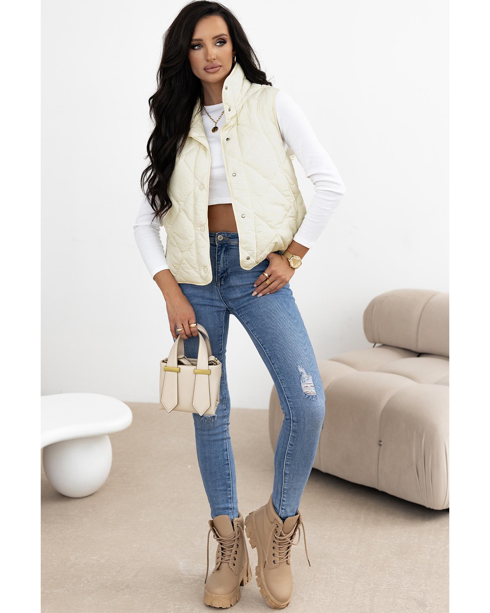 This beige quilted vest features a high neck design and a button-up front, combining style and warmth. Its sleek appearance and functional pockets make it a versatile addition to your wardrobe, perfect for layering over sweaters and jeans for a cozy, fashionable look.