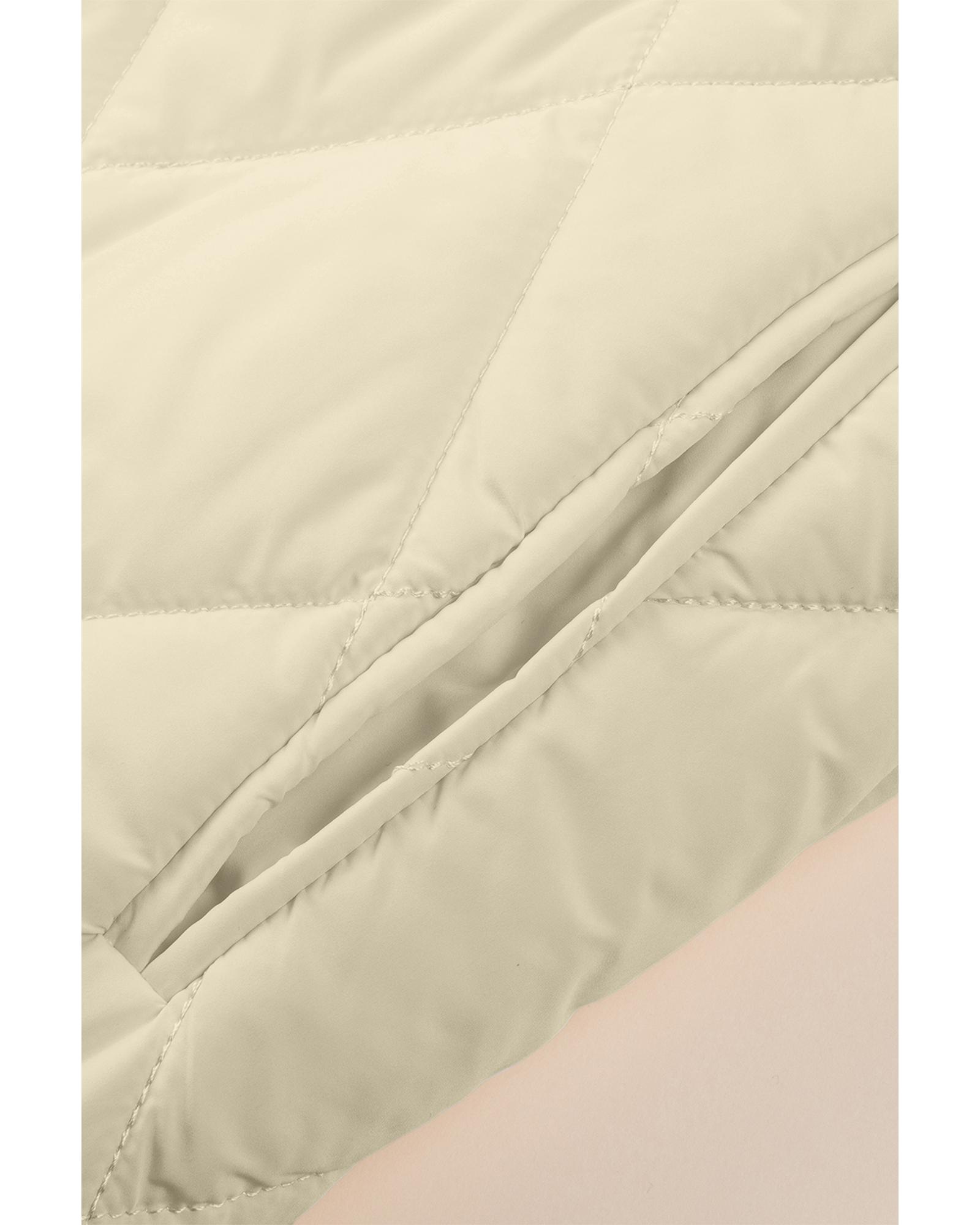 This beige quilted hooded coat features a stylish and functional design, combining a trendy fitted look with practical details. It is suitable for various outfits and offers a lightweight yet insulating puffer style for comfort and warmth.