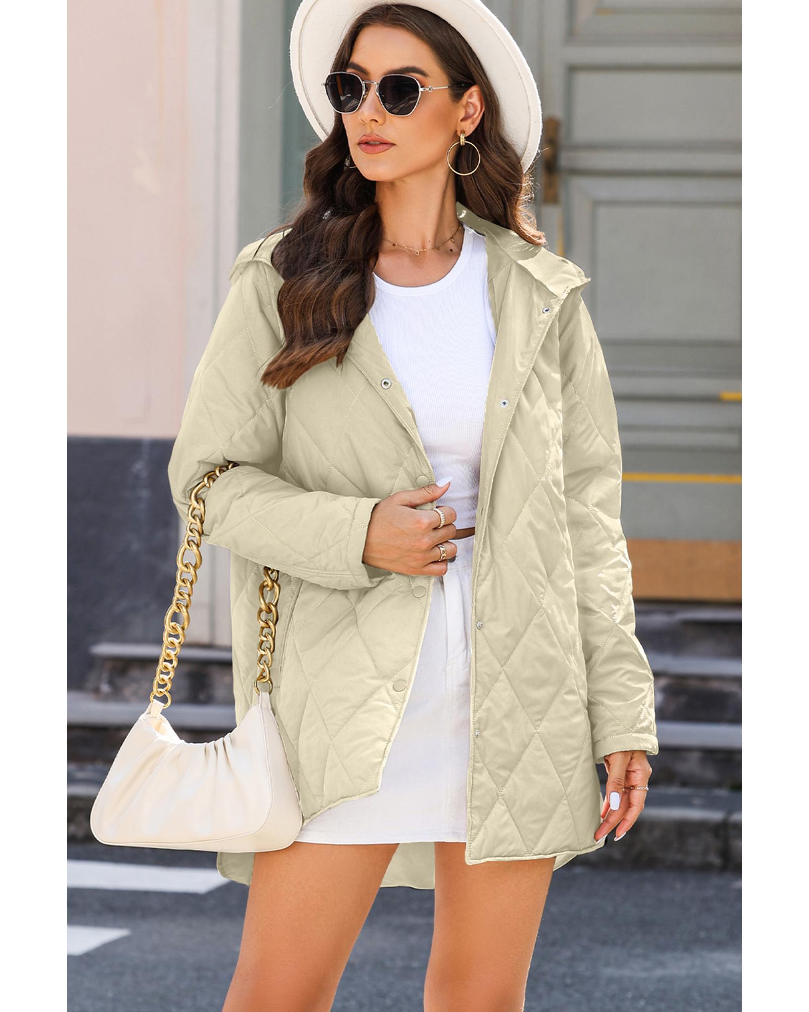 This beige quilted hooded coat features a stylish and functional design, combining a trendy fitted look with practical elements. It is suitable for various outfits and offers a lightweight yet insulating puffer style, making it ideal for cooler weather.