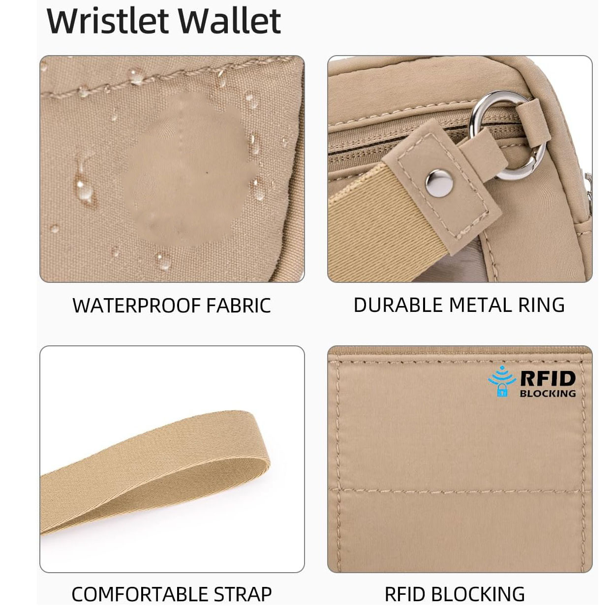Beige RFID Blocking Nylon Wristlet Clutch Wallet – Compact Waterproof Pouch with Card Slots & ID Window