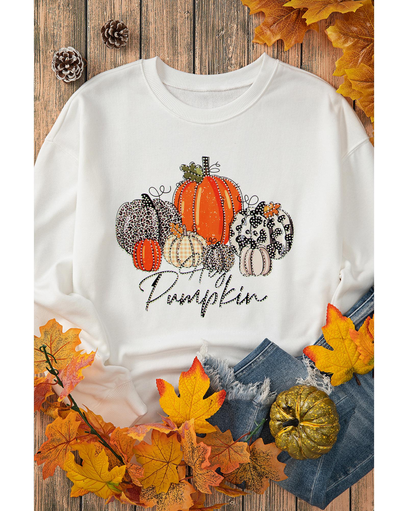 This beige sweatshirt features a festive rhinestone pumpkin graphic, making it an ideal choice for celebrating Thanksgiving and the holiday season. Its stylish design combines comfort and trendiness, perfect for pairing with various bottoms and accessories to create a chic look.