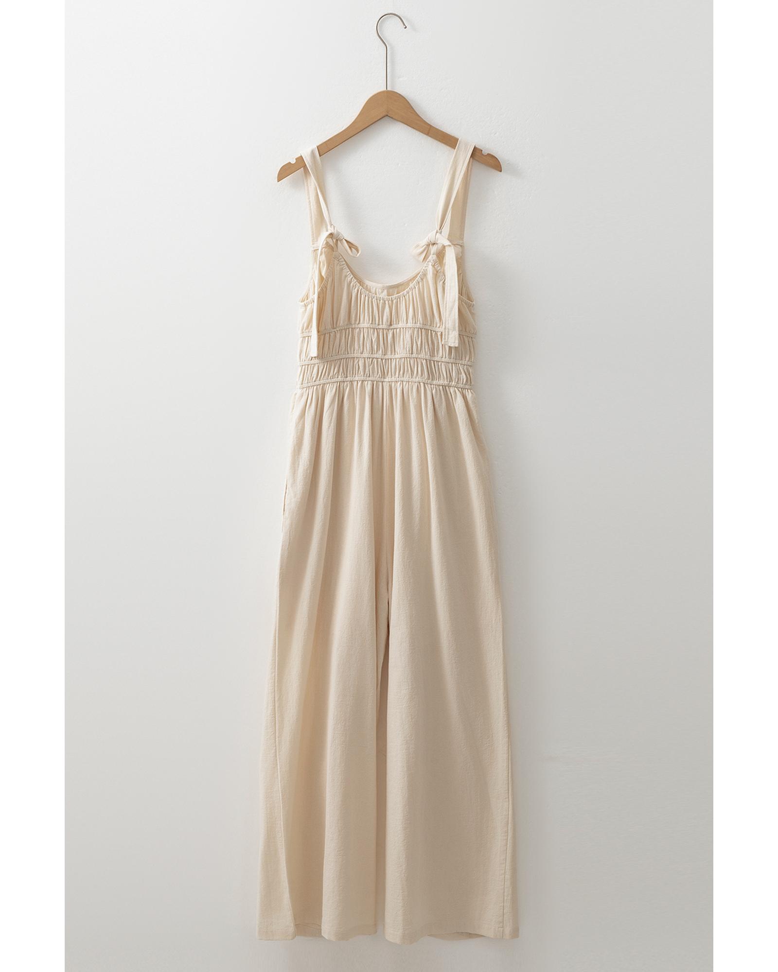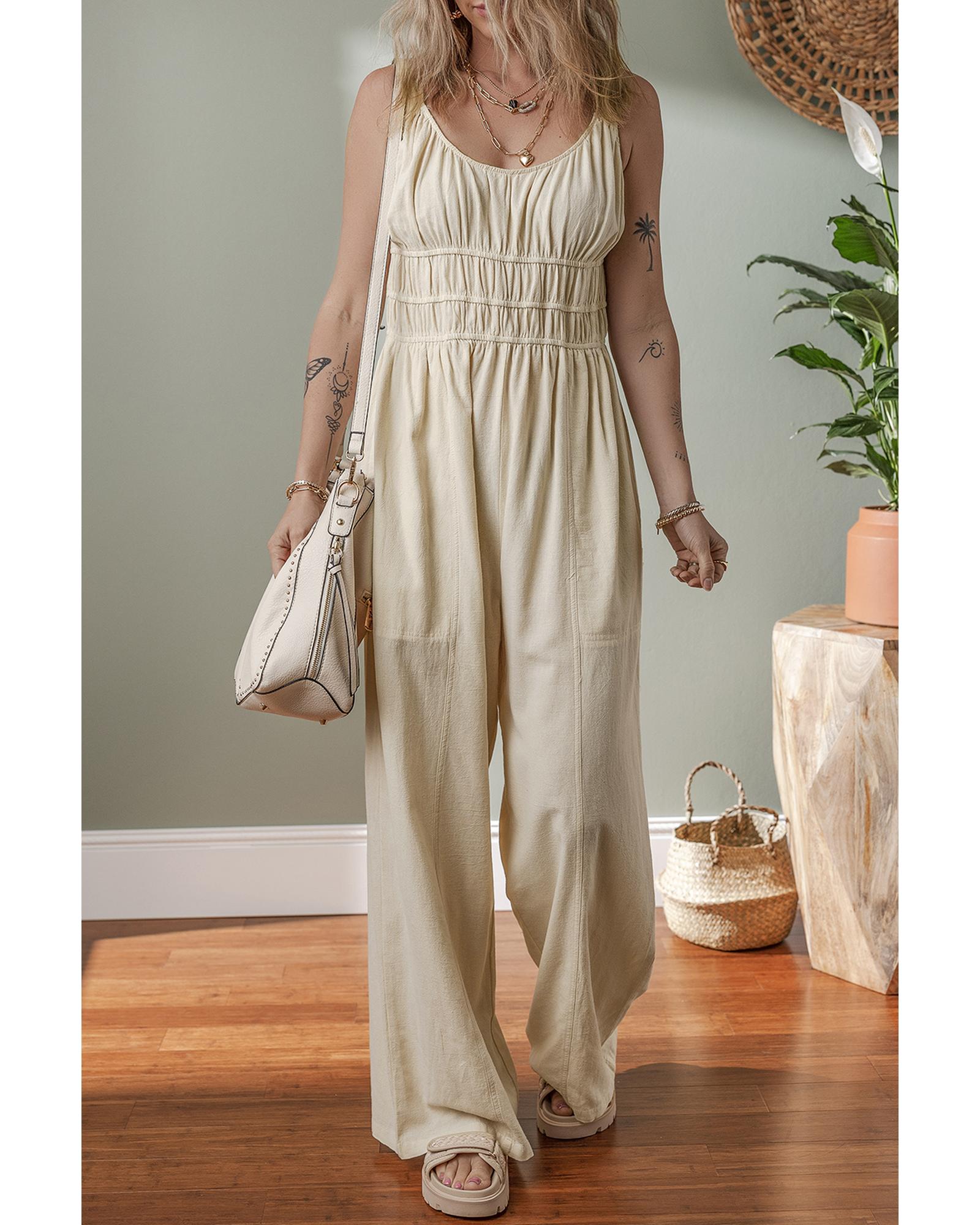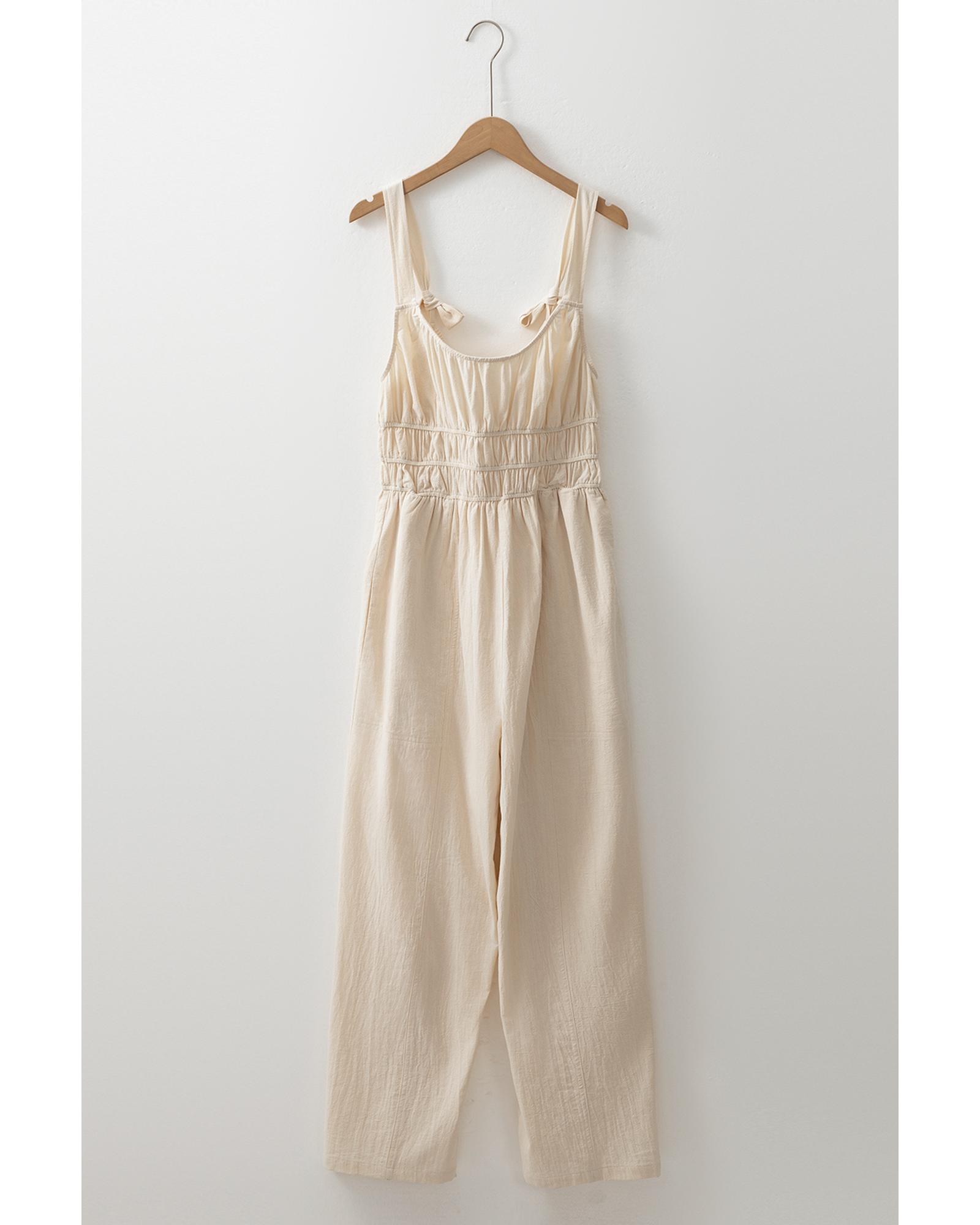 This beige sleeveless jumpsuit features a high waist design and wide-leg silhouette, offering a stylish and modern look. The ruched detailing adds texture and visual interest, making it a versatile piece suitable for various occasions. Crafted from 100% cotton, it combines comfort with fashion.