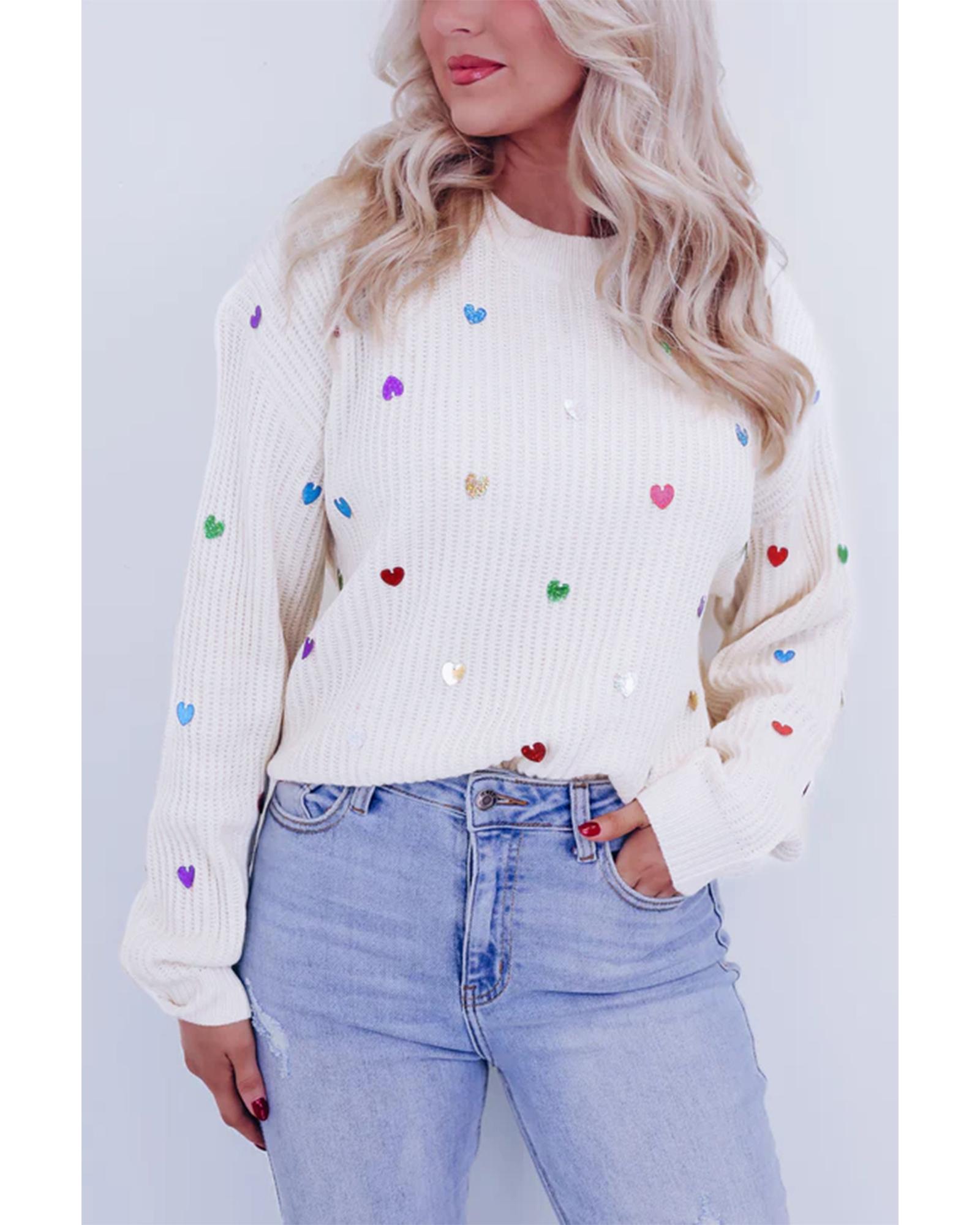 Beige Sequin Heart Shape Waffle Knit Round Neck Sweater – L