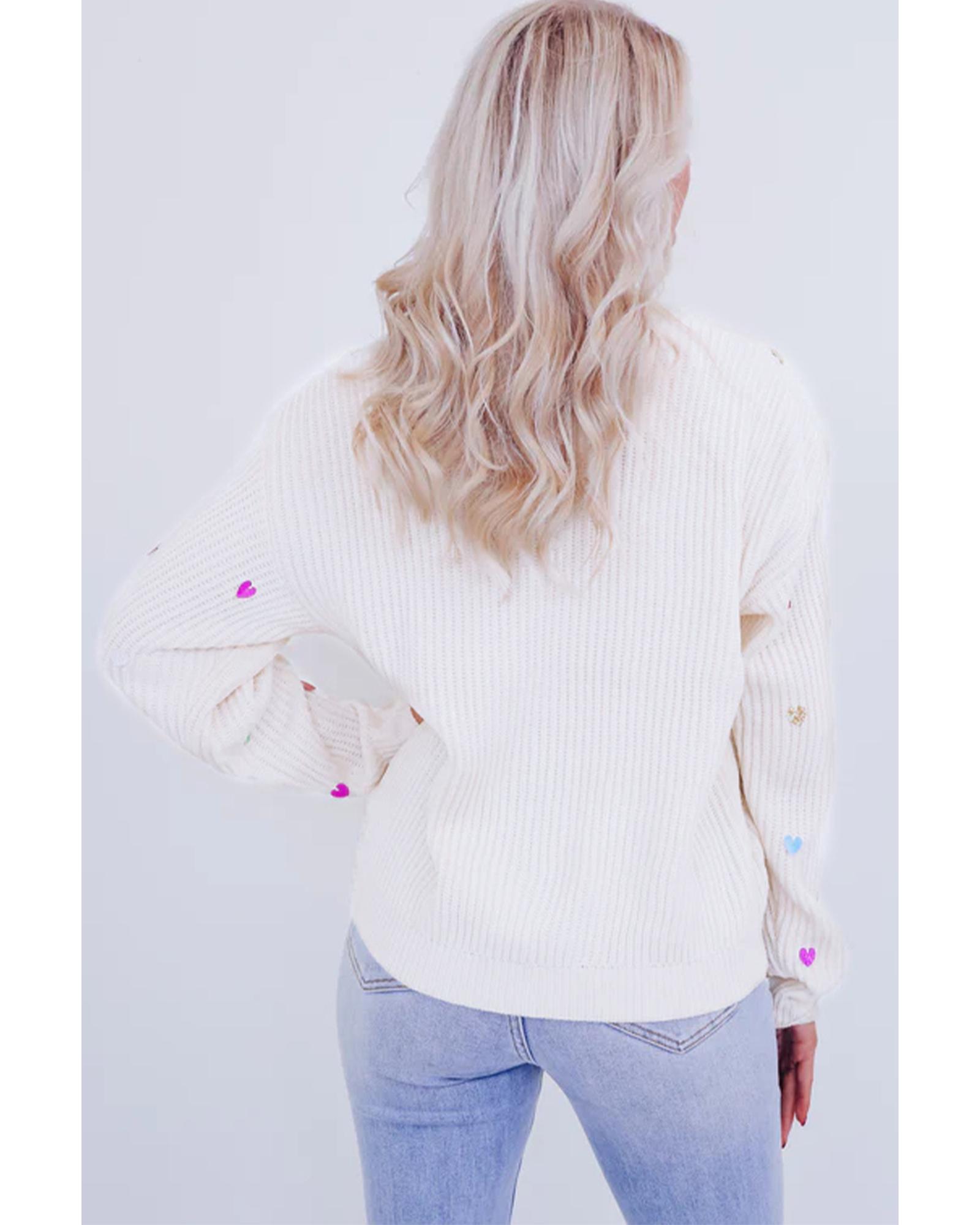 Beige Sequin Heart Shape Waffle Knit Round Neck Sweater – XL