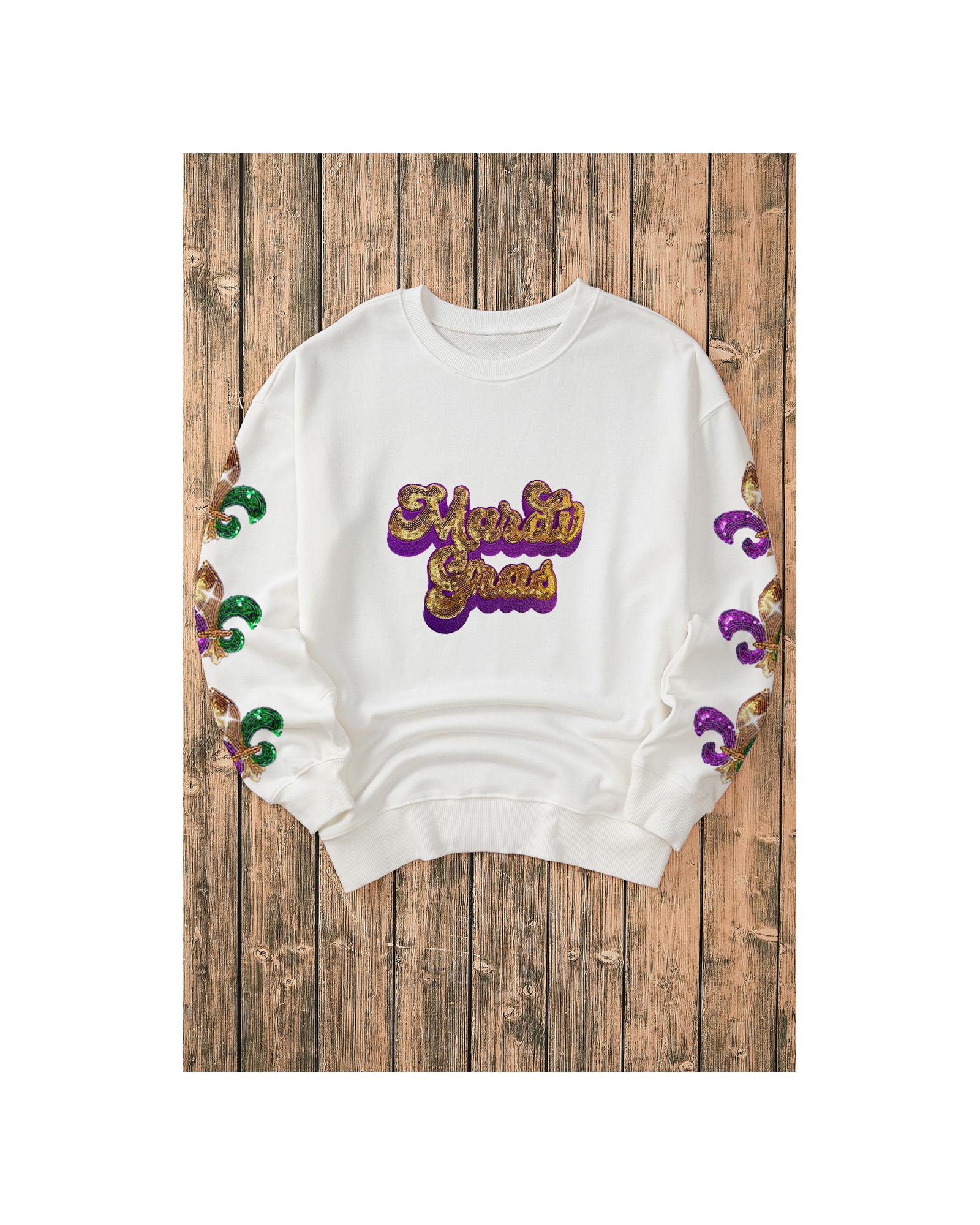This sweatshirt features a trendy fitted design with a vibrant Mardi Gras theme, highlighted by sequins spelling out the event name on the front and glitter Fleur De Lis accents on the sleeves. It offers a comfortable fit with a dropped shoulder style, making it suitable for casual wear.