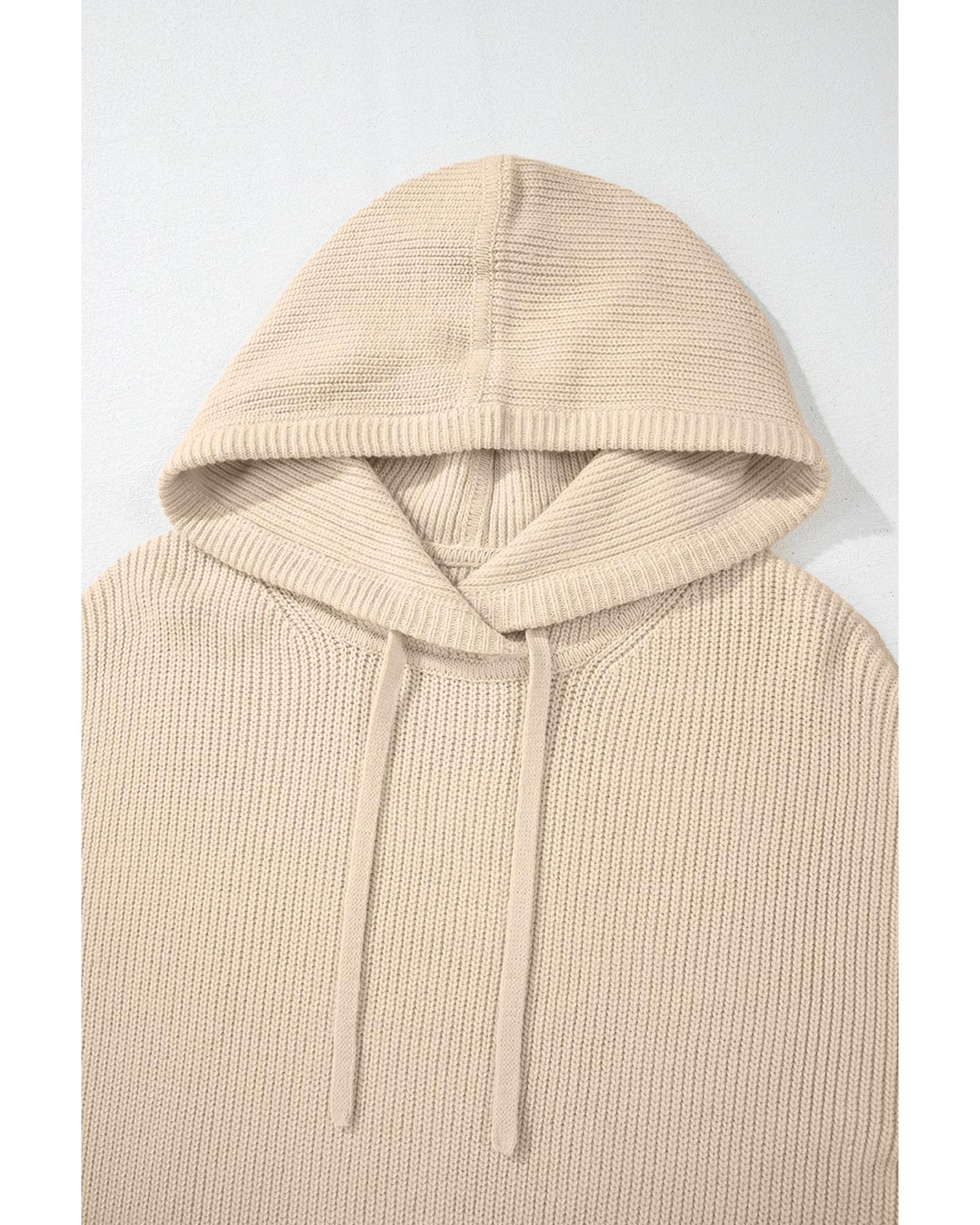 This beige solid color hooded pullover sweater features a relaxed drop shoulder design, offering a trendy and comfortable fit. Made from high-quality materials, it ensures durability and comfort. Its versatile style makes it suitable for pairing with skirts, jeans, or pants, making it a great addition to any wardrobe.