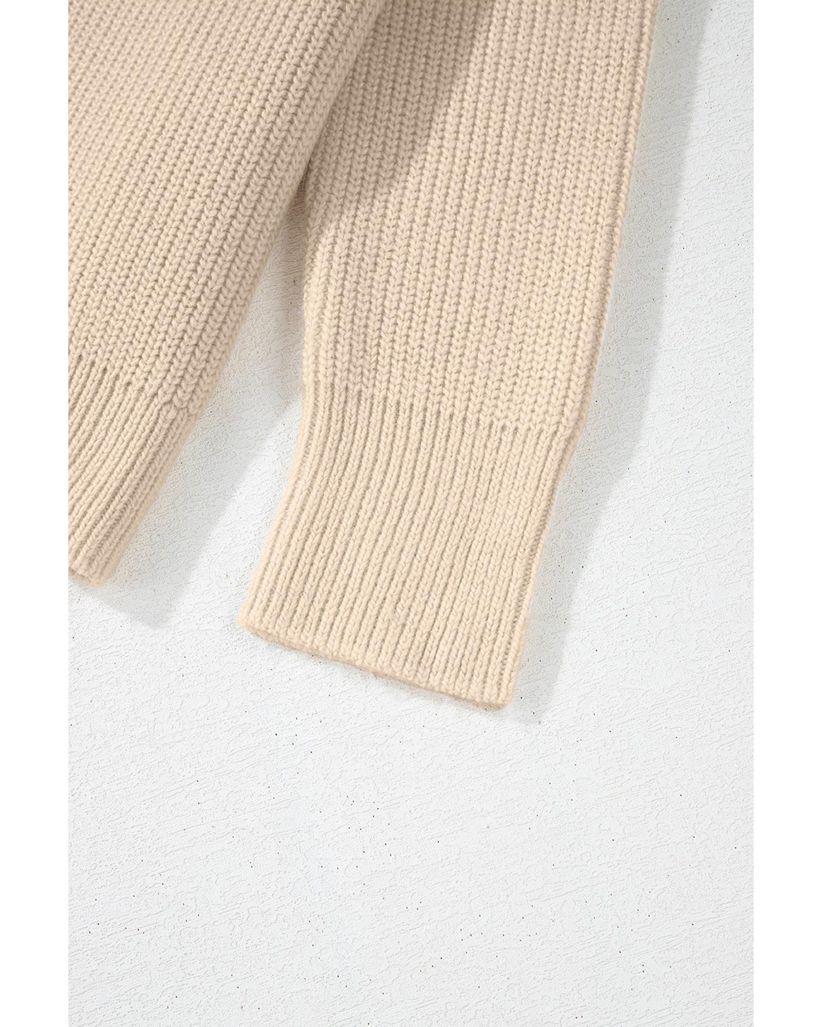 Beige Solid Color Drawstring Hooded Drop Shoulder Pullover Sweater – M