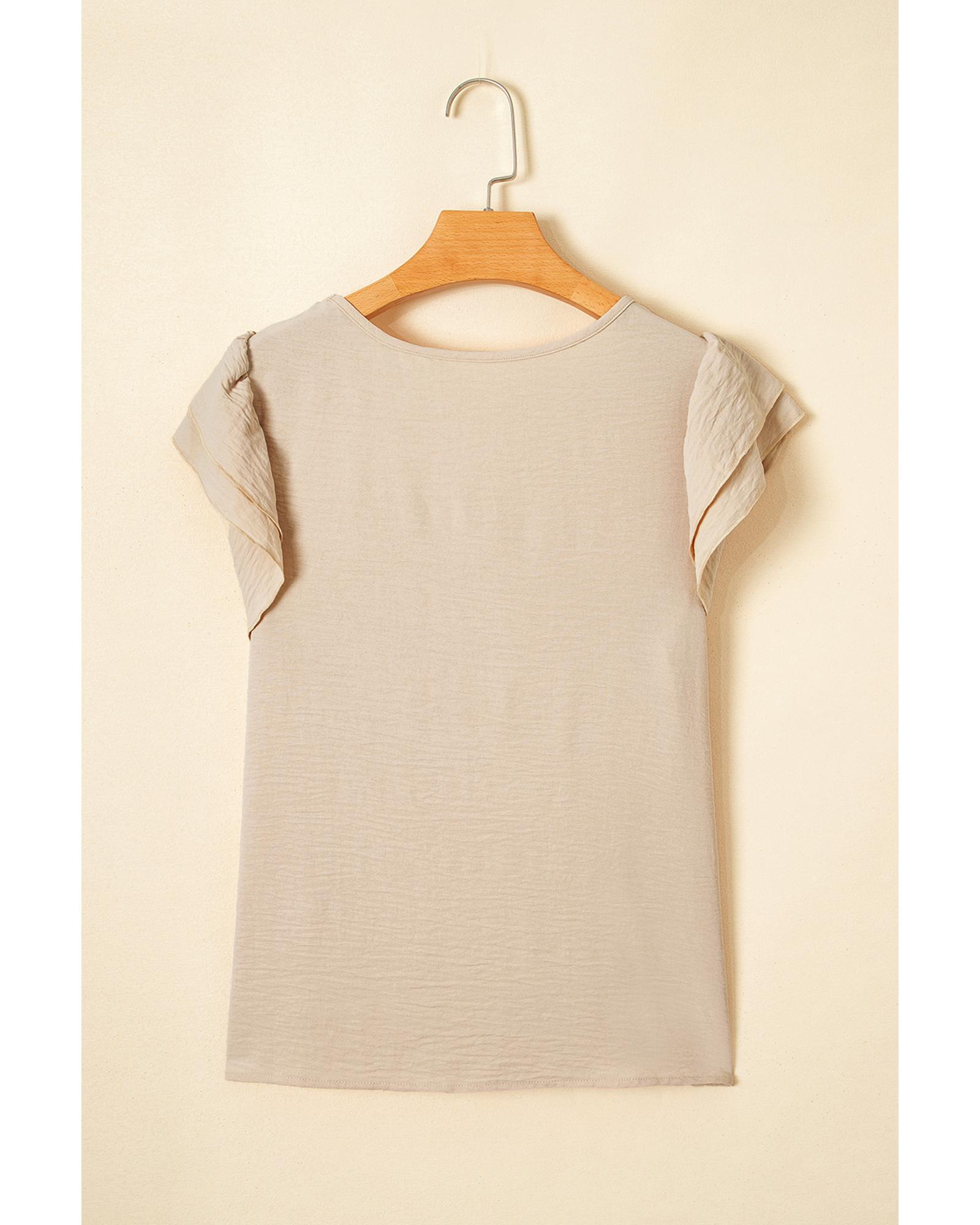 This beige solid color blouse features a stylish ruffled design and short sleeves, making it perfect for casual occasions. Its versatile color pairs well with various bottoms, offering a flattering and comfortable fit for everyday wear.