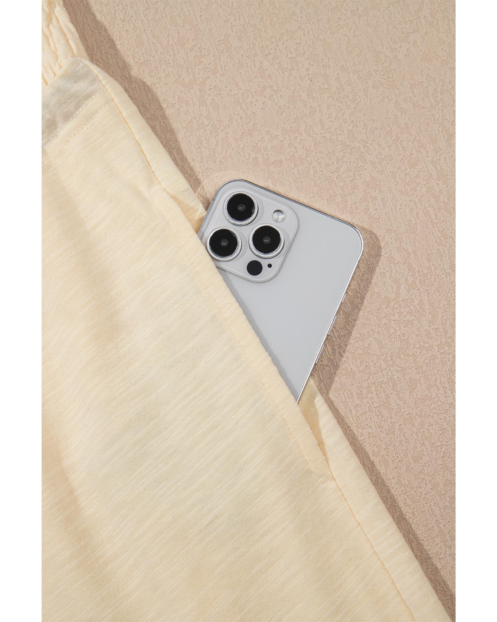 This beige solid color tank top and smocked waist pants set offers a stylish and comfortable outfit option. The sleeveless design makes it easy to layer, while the smocked waist provides stretch and adjustability. The wide-leg pants contribute to a relaxed and trendy look, perfect for casual wear.