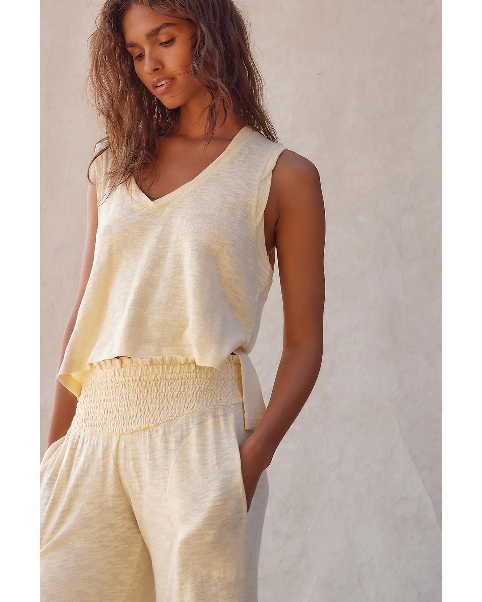 This beige solid color tank top and smocked waist pants set offers a comfortable and stylish look. The sleeveless design makes it easy to layer, while the smocked waist provides stretch and adjustability. The wide-leg pants contribute to a relaxed and trendy appearance, making it suitable for casual wear.