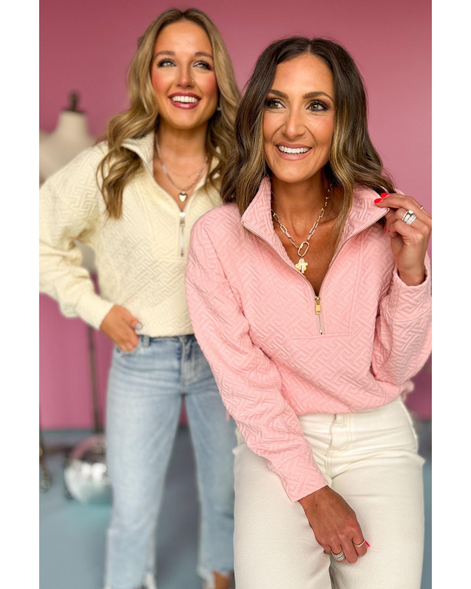 This beige solid textured sweatshirt features a half zipper and a collared neckline, offering a versatile and sophisticated style suitable for various indoor and outdoor activities. Designed with a trendy fitted look, it is ideal for effortless layering and modern fashion.