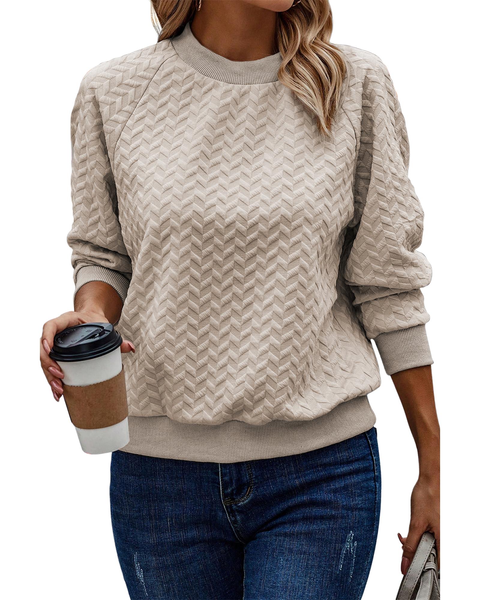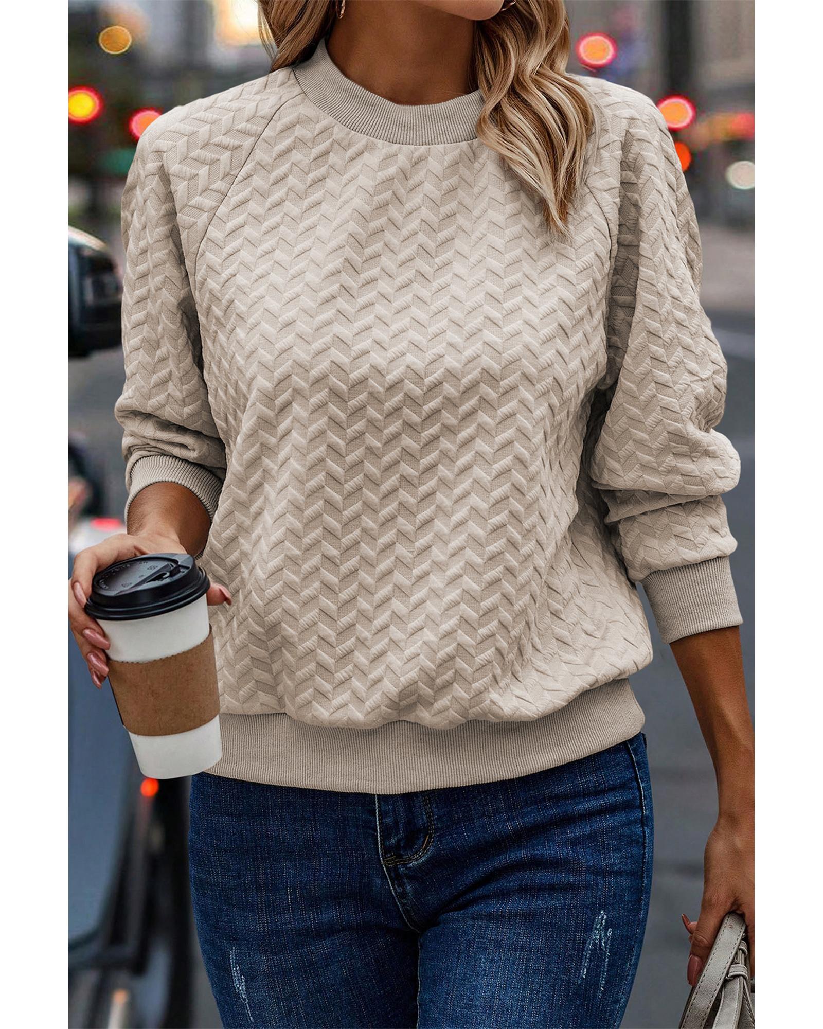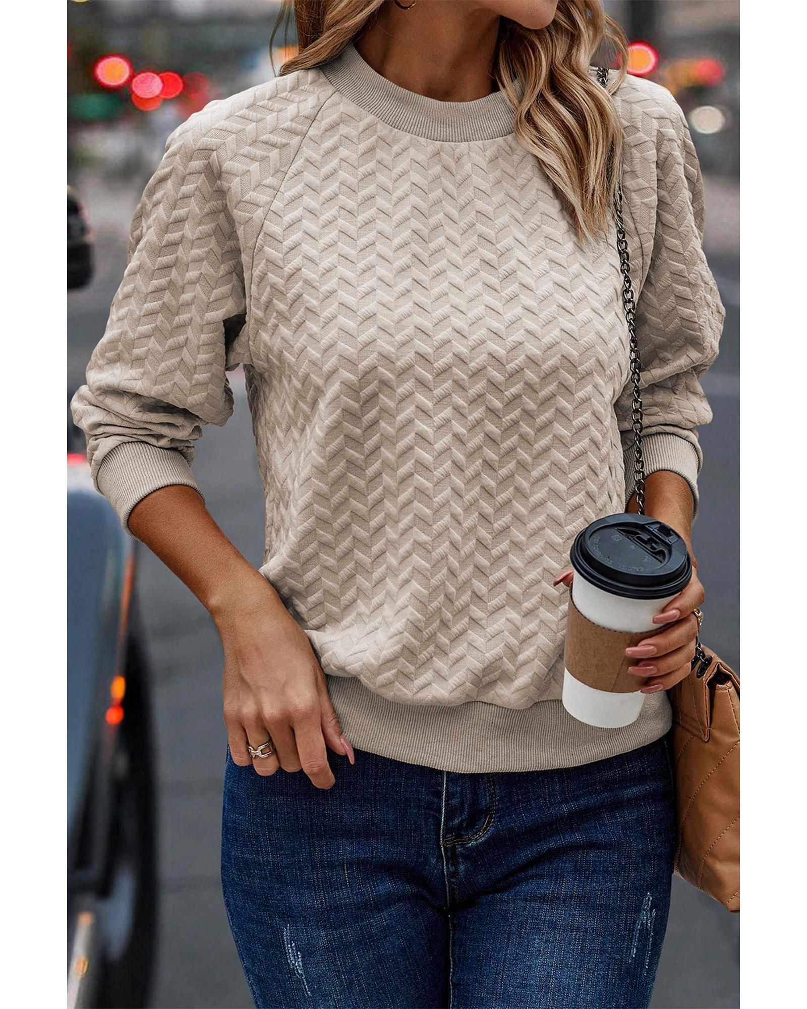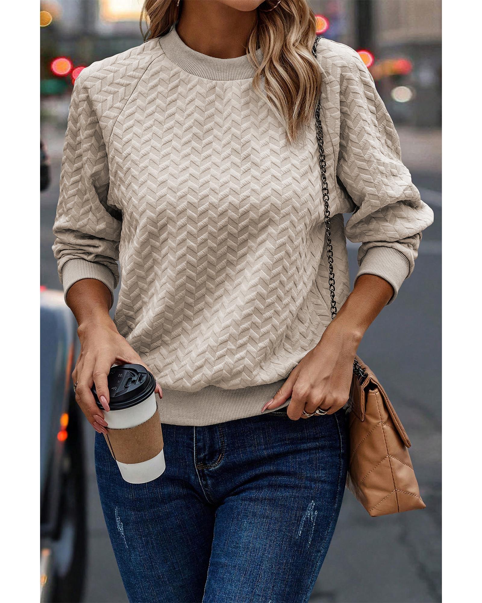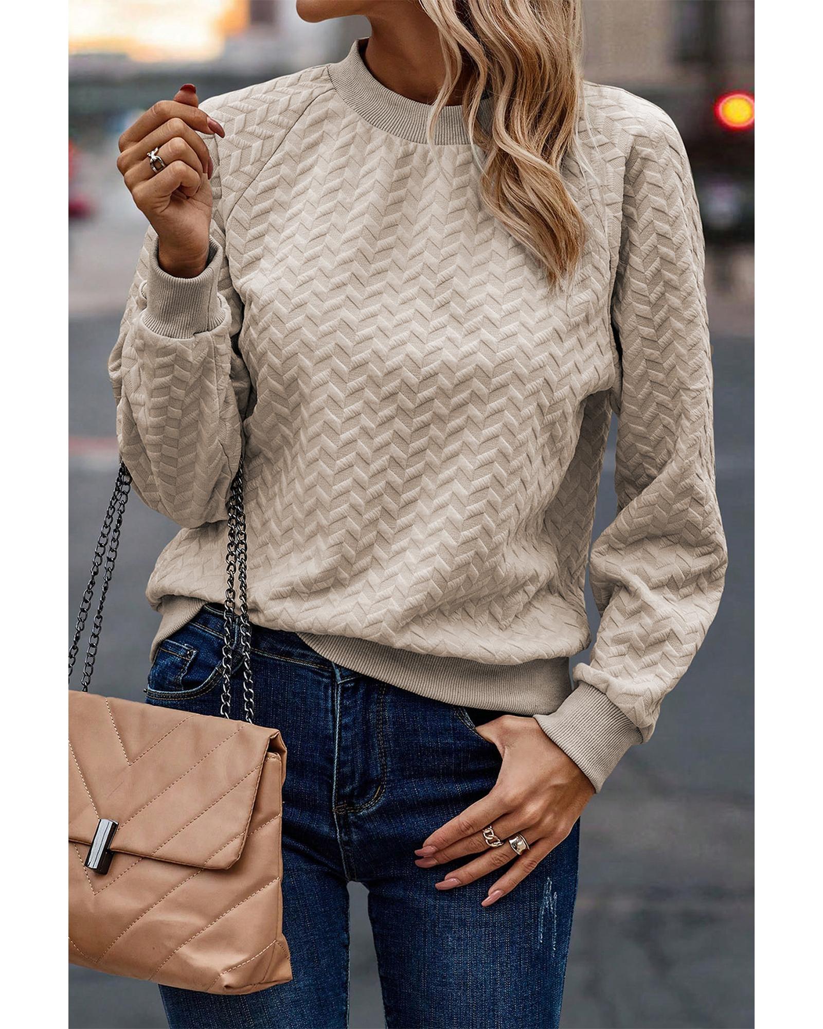 This beige solid textured pullover sweatshirt features a trendy fitted design with raglan sleeves, making it a versatile and stylish addition to any wardrobe. Crafted from a soft and textured fabric, it offers comfort and coziness for everyday wear. The solid color and classic silhouette make it easy to style with various outfits, suitable for all body types.