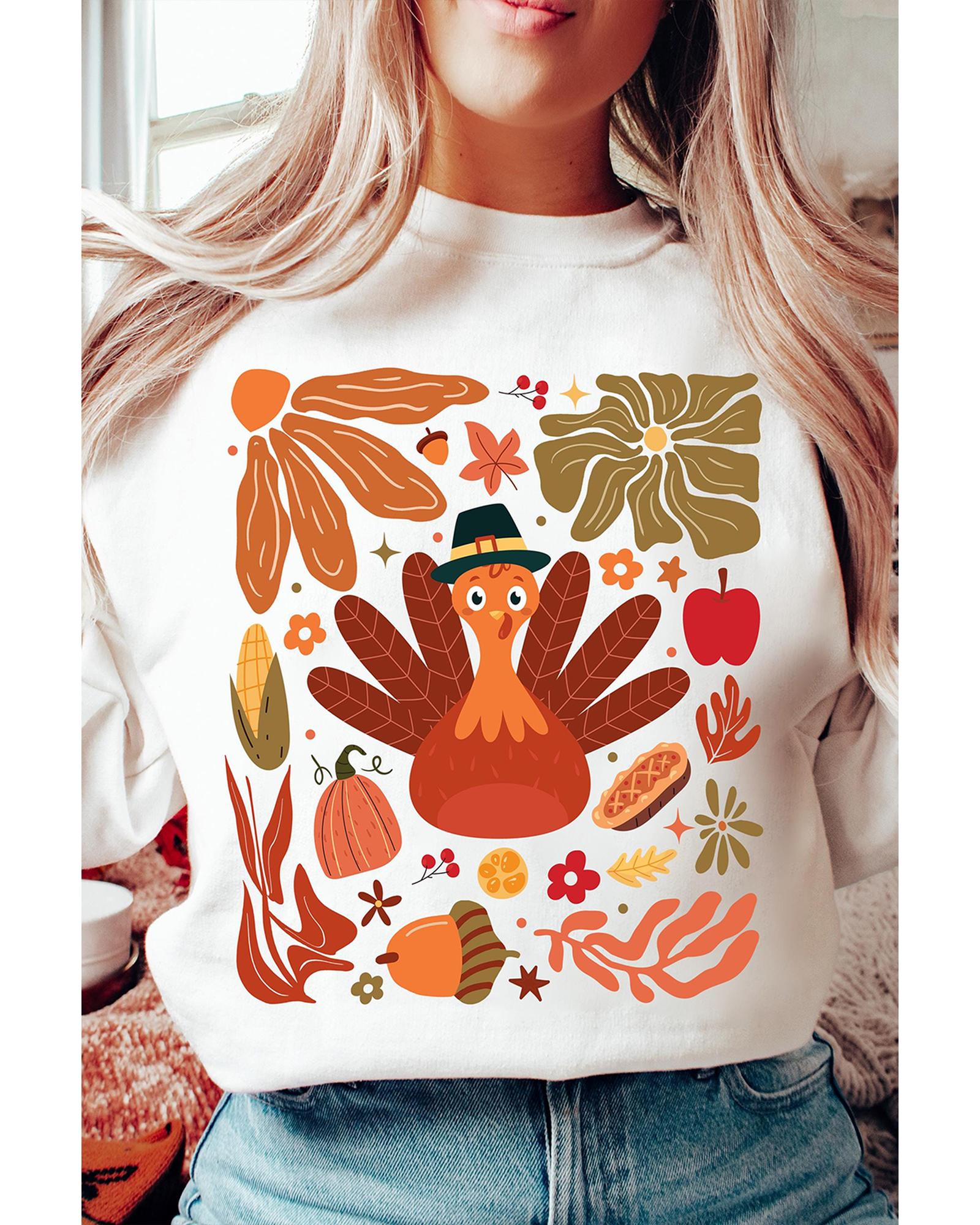 This beige crew neck sweatshirt features a festive Thanksgiving turkey graphic, making it perfect for celebrating the fall season. Its relaxed fit ensures comfort for everyday wear or festive gatherings, and it pairs well with jeans or casual pants to elevate your casual style.