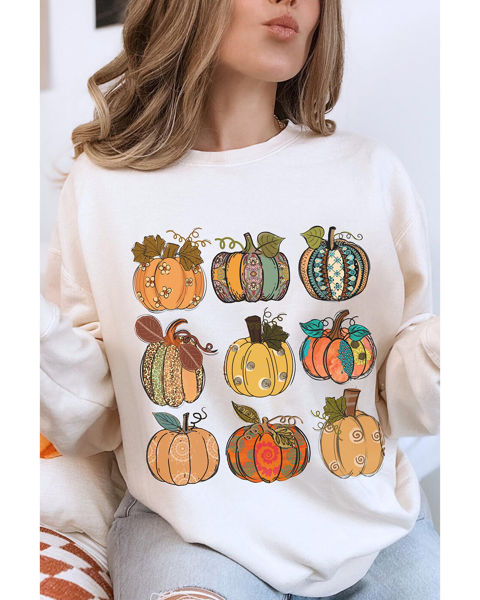 This beige sweatshirt features a festive Thanksgiving pumpkin print, making it a cozy and stylish choice for the holiday season. Its relaxed fit with drop shoulders and a crew neck provides comfort and a trendy look. Perfect for pairing with jeans or leggings, it adds a cheerful touch to your festive wardrobe.