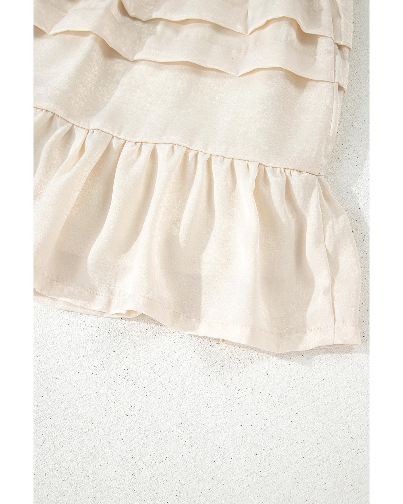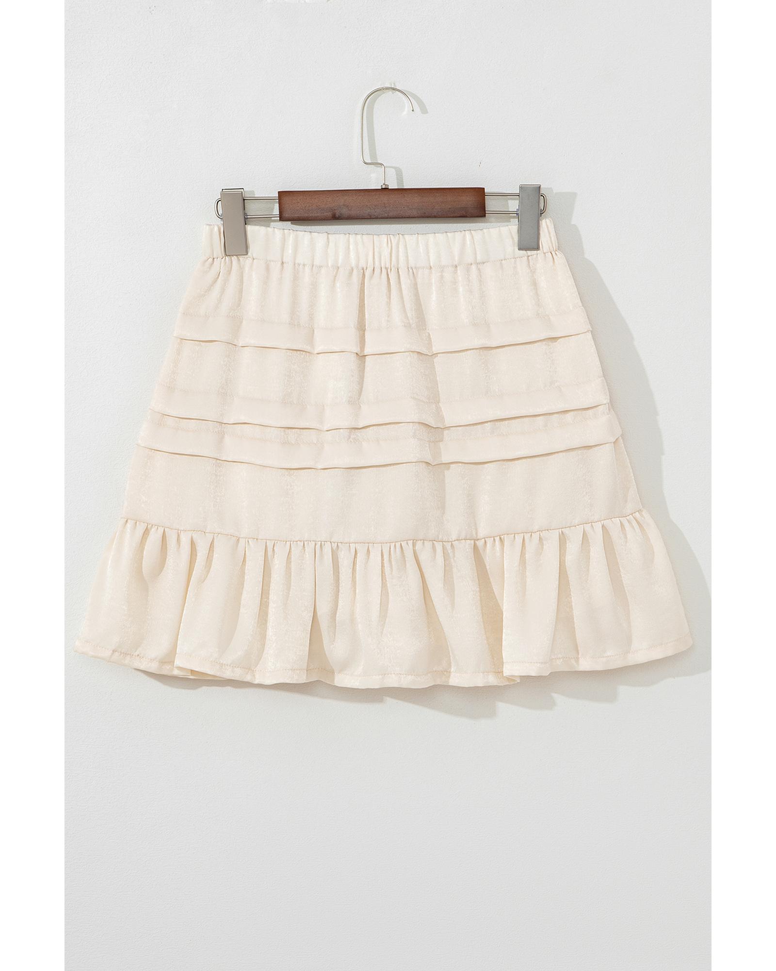 This beige mini skirt features a tiered design with a ruffled hemline, offering a stylish and flattering look. The elastic waistband ensures a comfortable fit, making it suitable for various occasions. Its versatile style pairs well with tees and tanks for a casual or semi-formal outfit.