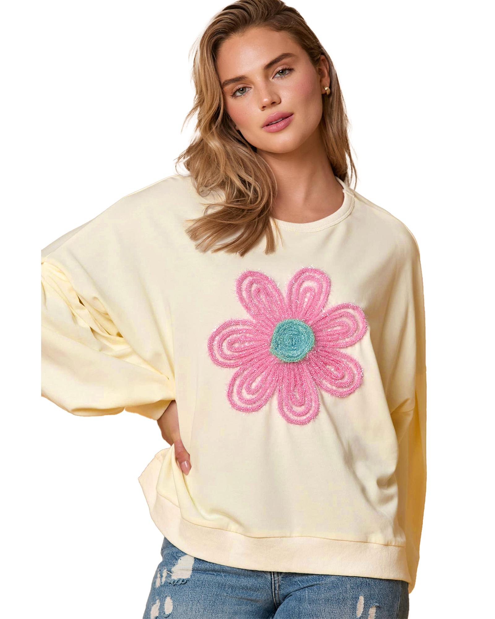 Beige Tinsel Flower Dropped Puff Sleeve Sweatshirt – L