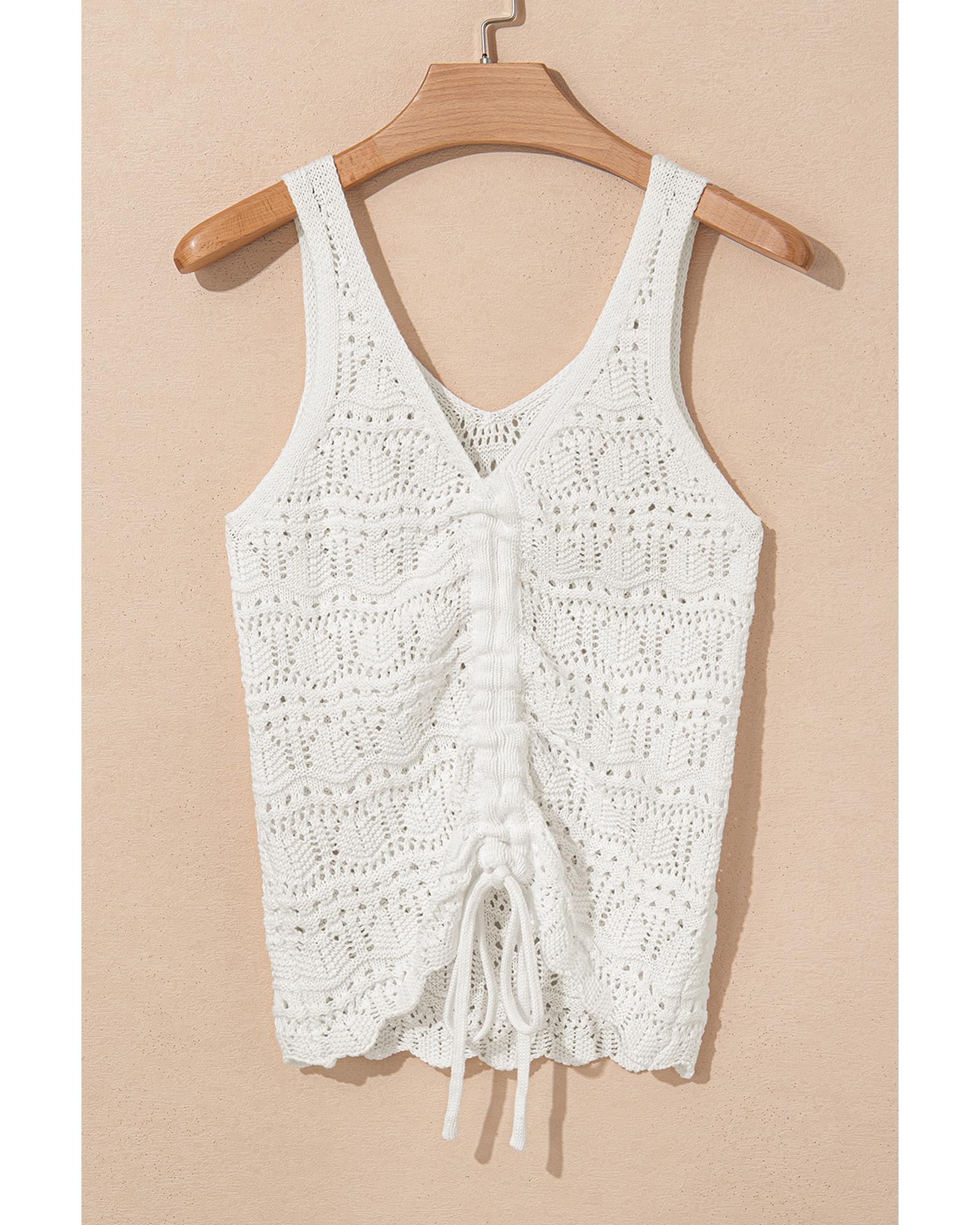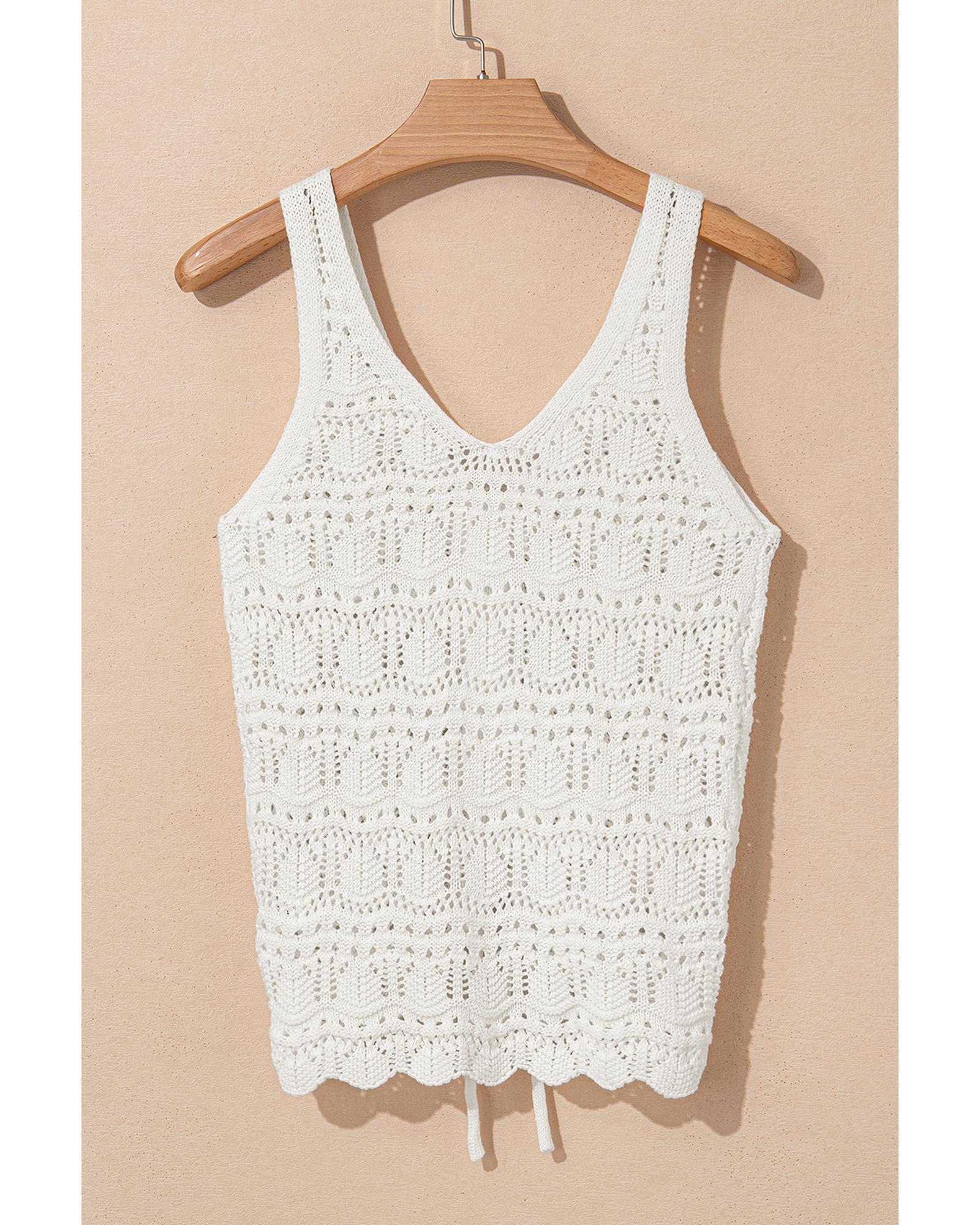 This trendy beige sweater vest features a hollowed knit design with a V neckline and a drawstring at the front. The scallop hemline and unique pointelle weave add distinctive style, making it suitable for various occasions. Crafted from 100% cotton, it offers comfort and a perfect fit.