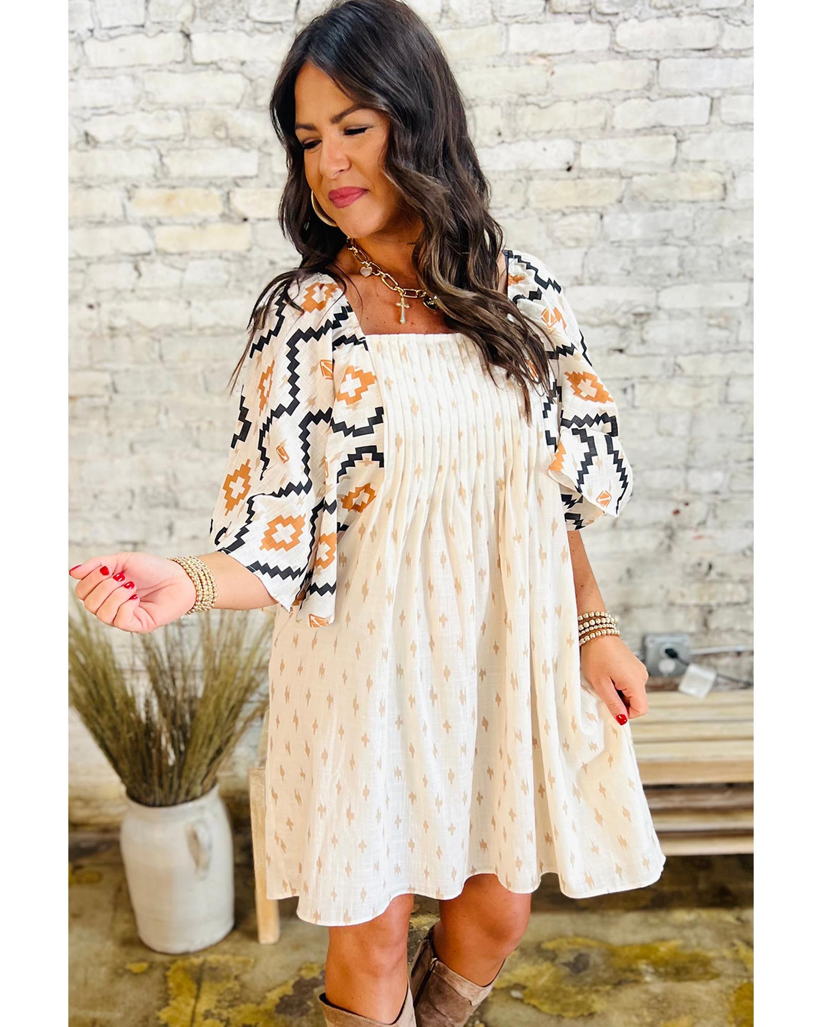 Beige Western Aztec Print Pleated Square Neck Loose Mini Dress – M