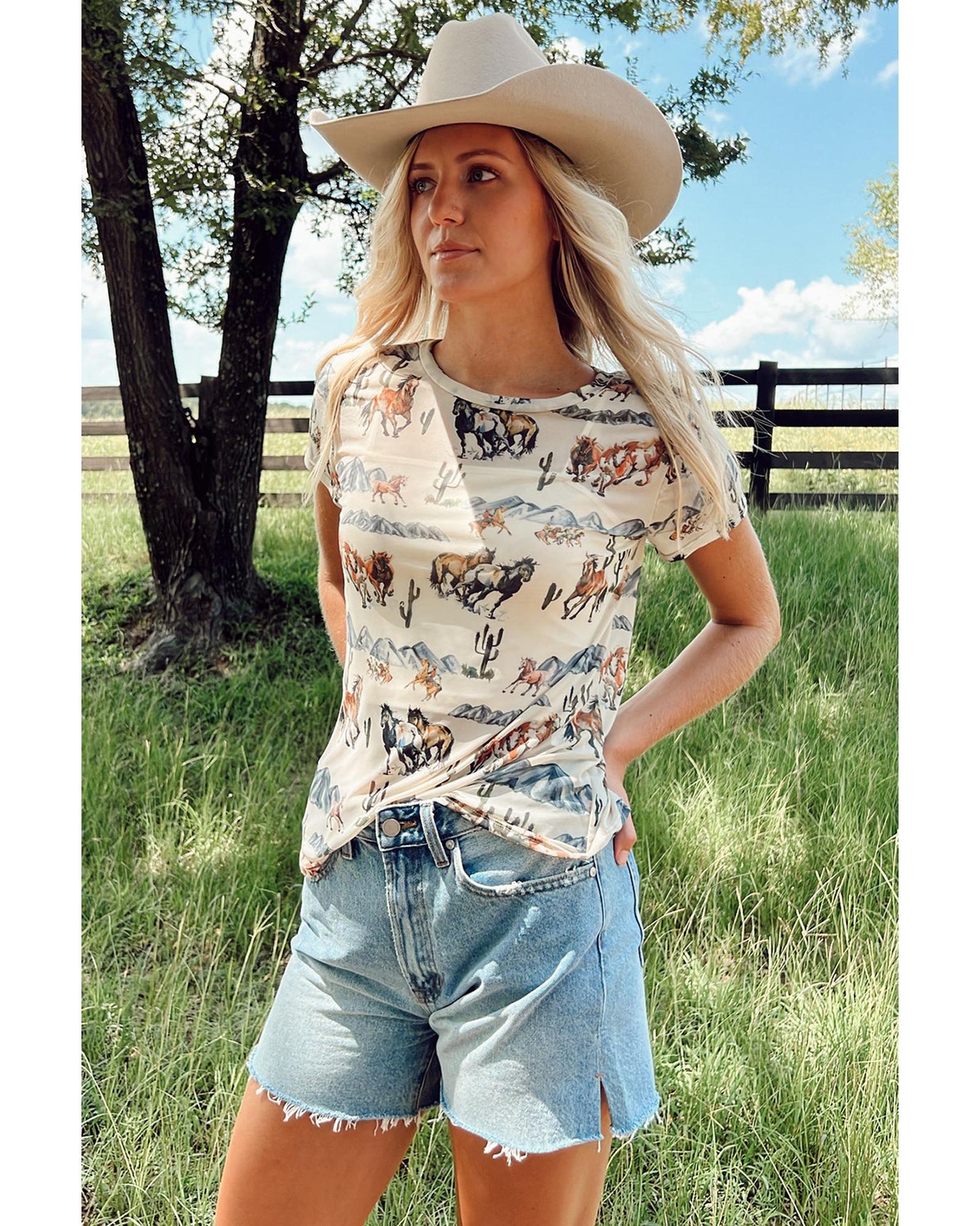 This Western-style mesh T-shirt features a stylish Mustang River print, offering a trendy and comfortable fit suitable for daily wear. Made from breathable fabric, it provides optimal ventilation and a versatile look that pairs well with various outfits.