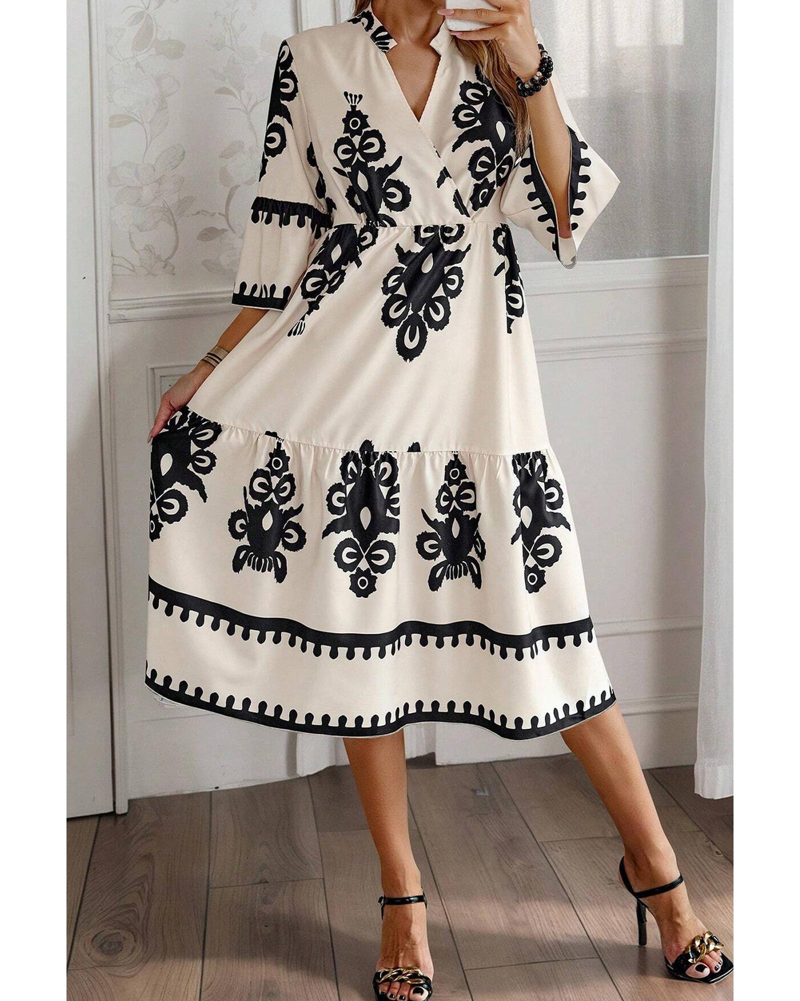 This beige midi dress features a Western-inspired geometric print and a flattering V-neck wrap design. The 3/4 sleeves and high waist detail create a stylish and versatile silhouette, suitable for various occasions.