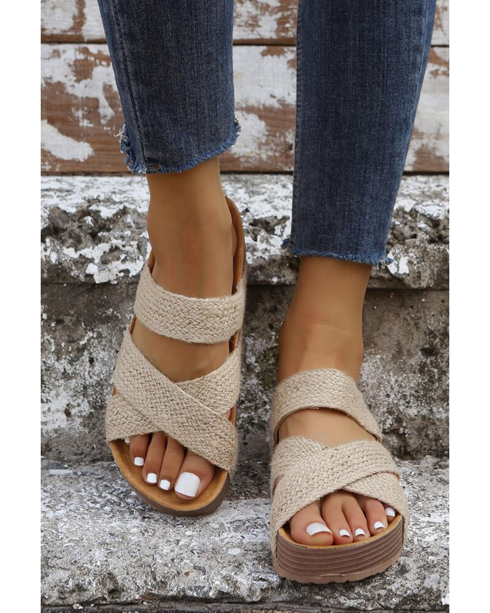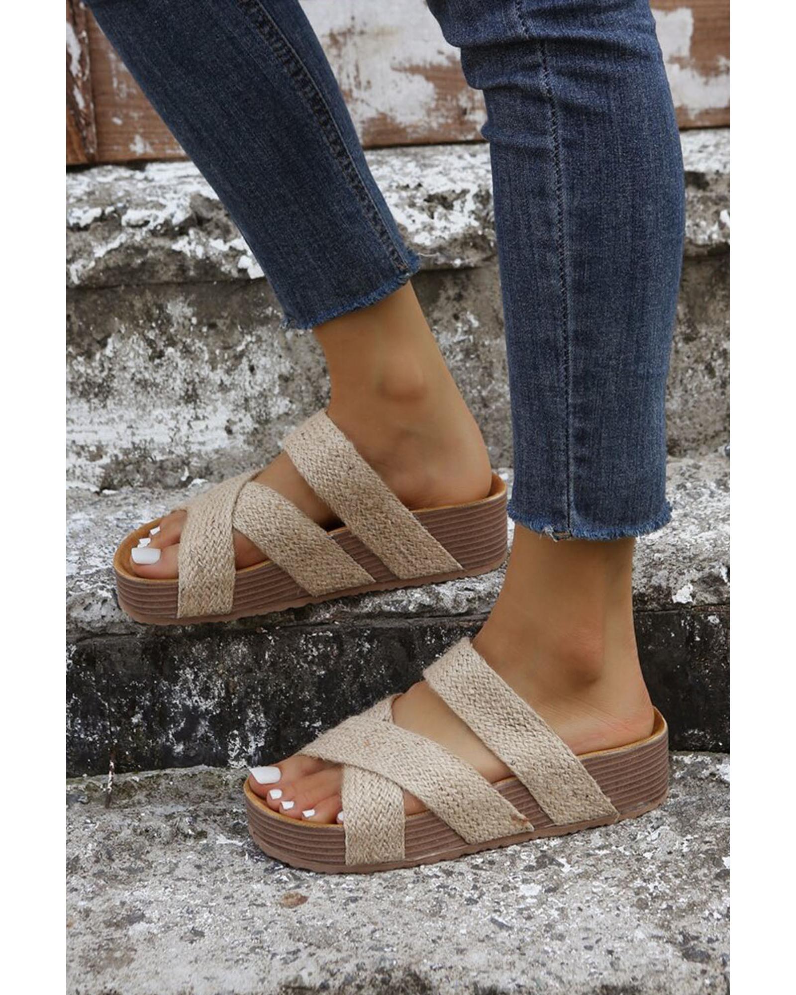 Package Content: One pair of beige woven cross criss hollowed slip-on slippers.