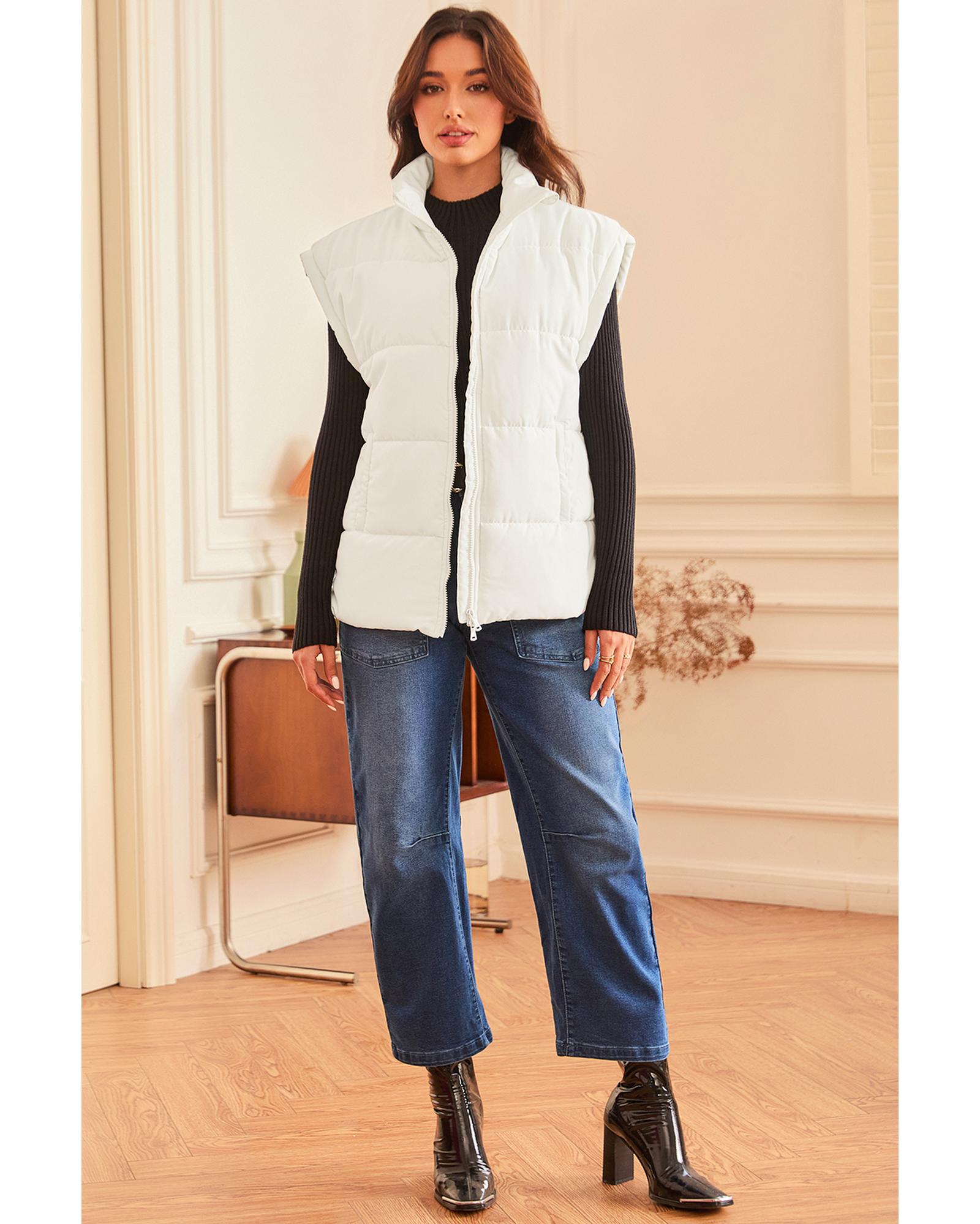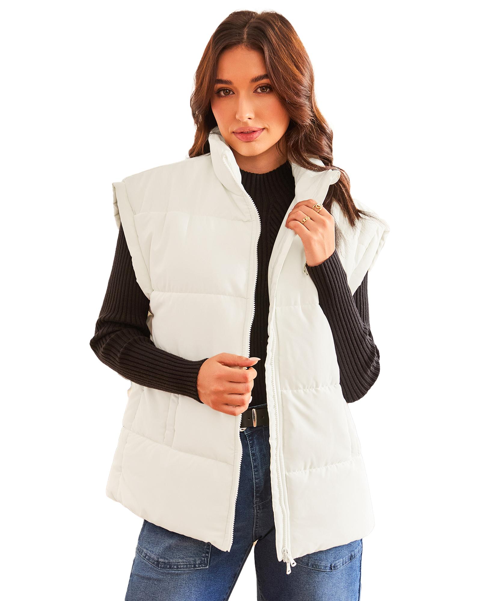 Beige Zipper Stand Neck Oversized Puffer Vest – L