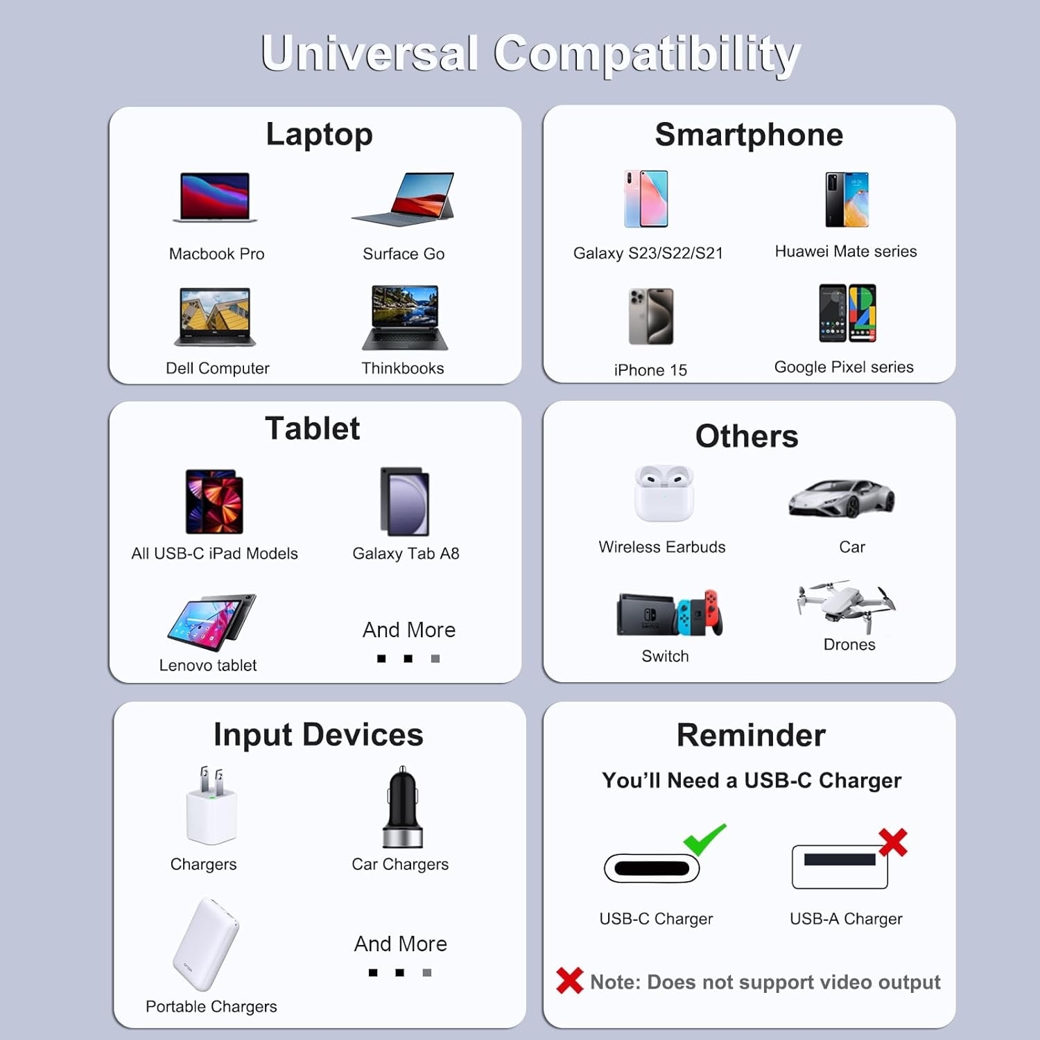 - Compatible Devices: USB-C smartphones, tablets, and laptops