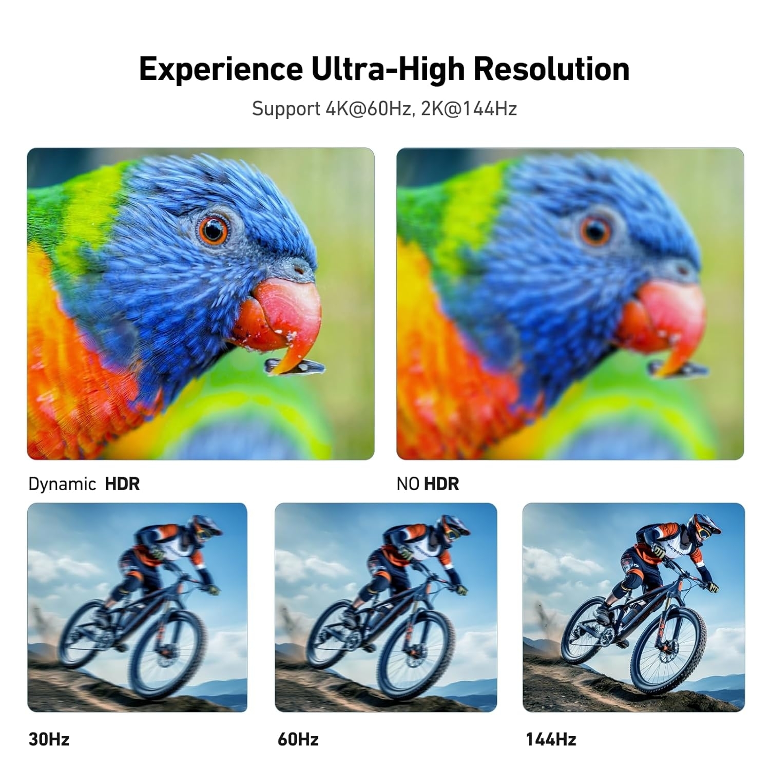 • Supports 4K UHD resolution at 60Hz, including 2K at 144Hz, 1080P, 720p, and other high-definition formats