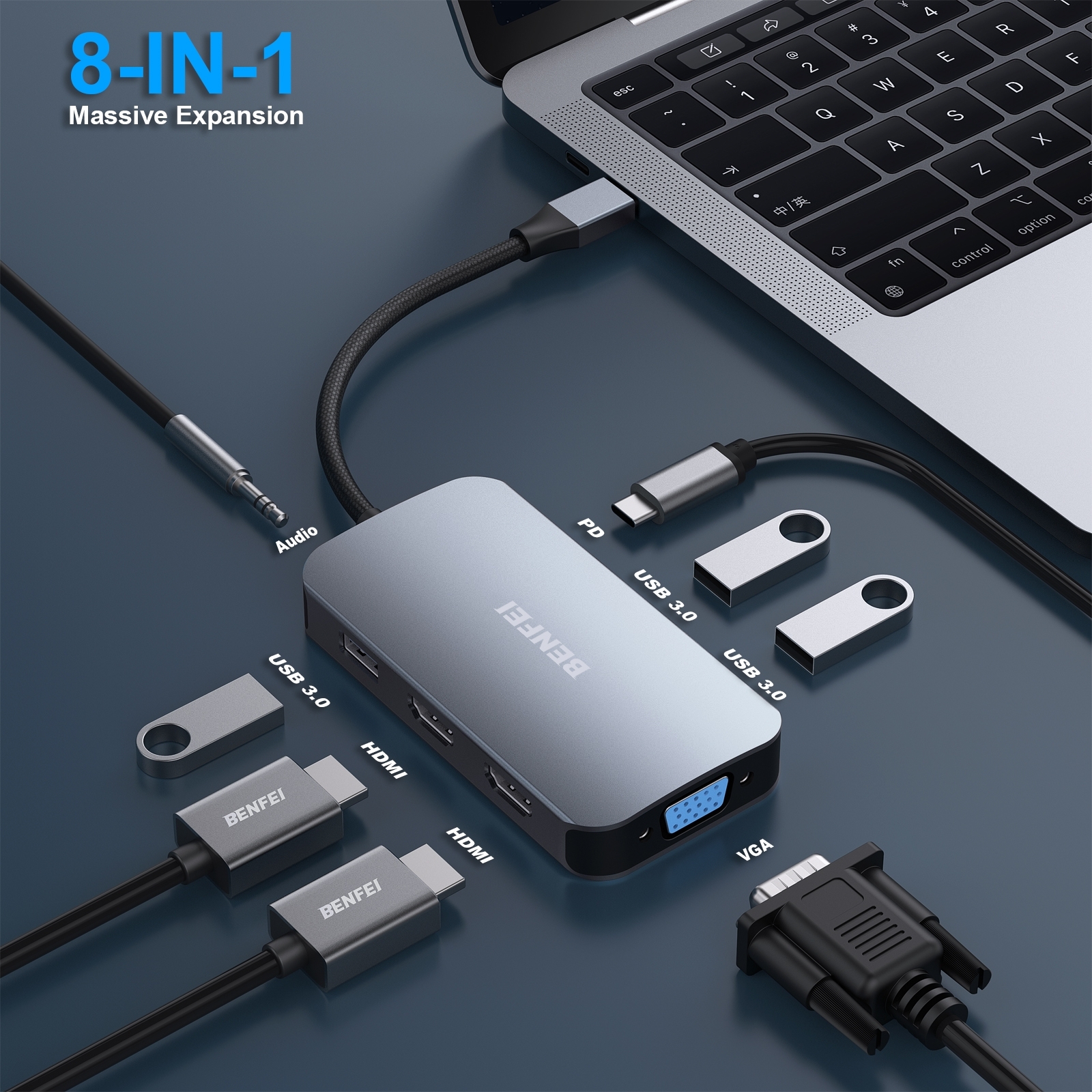 BENFEI 335GY USB-C Hub with Triple Display, 8-in-1 Docking Station (100W PD, Dual 4K HDMI, VGA, 3x USB 3.0)