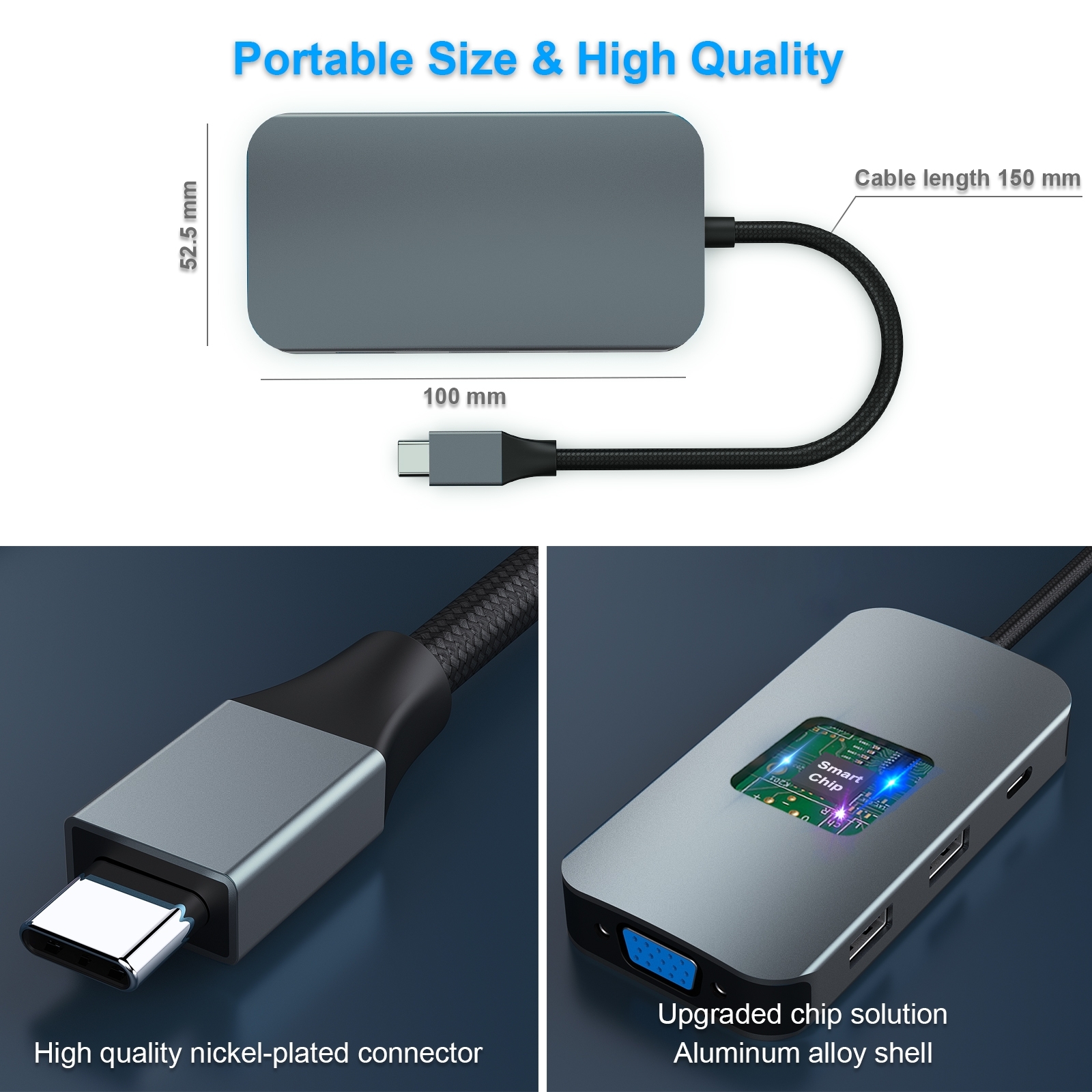 This versatile USB-C hub provides an all-in-one solution to expand your laptop’s connectivity options. It offers multiple ports including HDMI, VGA, USB 3.0, a power delivery port, and an AUX slot, allowing you to connect various devices and external displays effortlessly from a single USB-C port. Its lightweight design makes it easy to carry for presentations, extended desktop setups, or multimedia use.