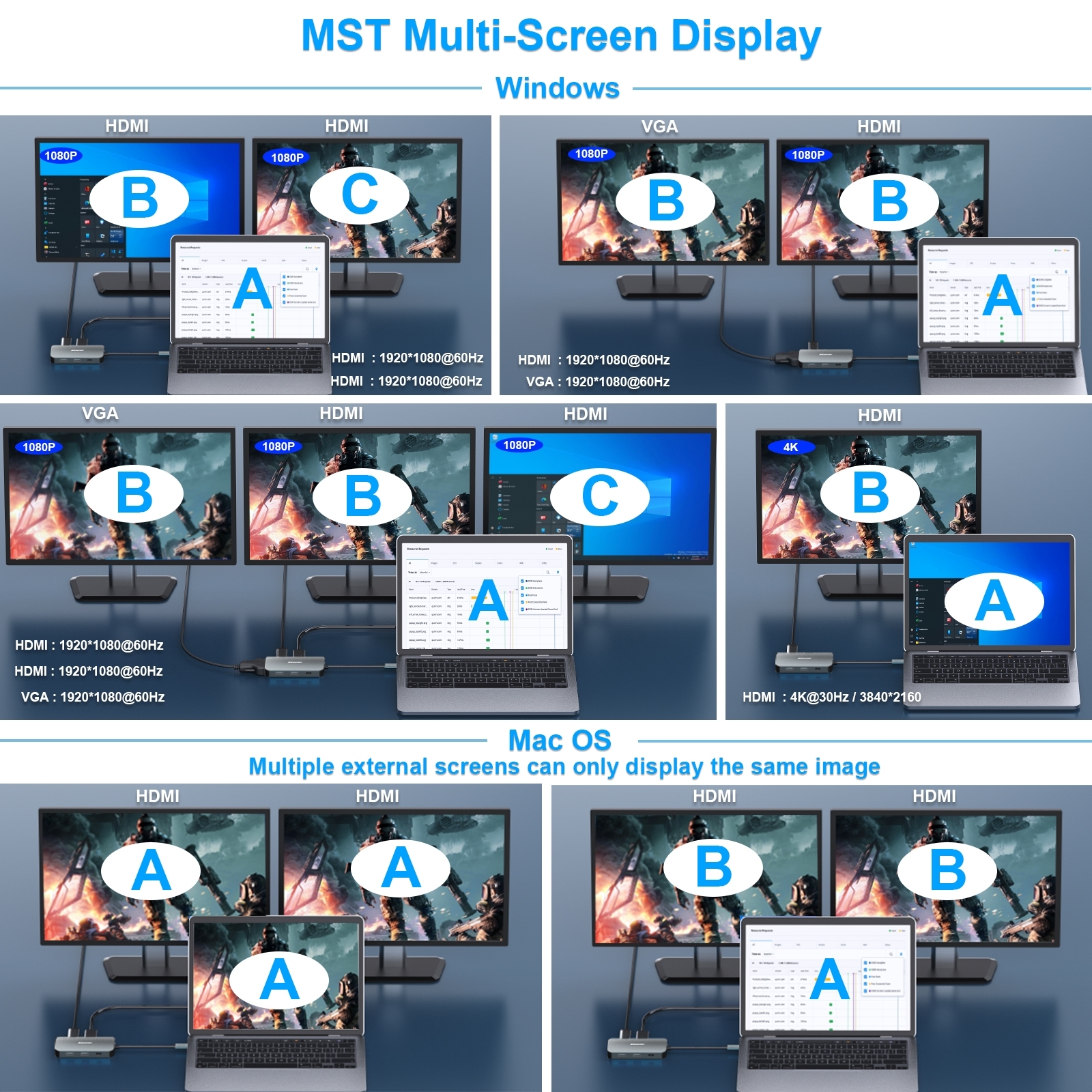 - Supports up to three screens simultaneously with MST technology, including dual HDMI and VGA outputs.