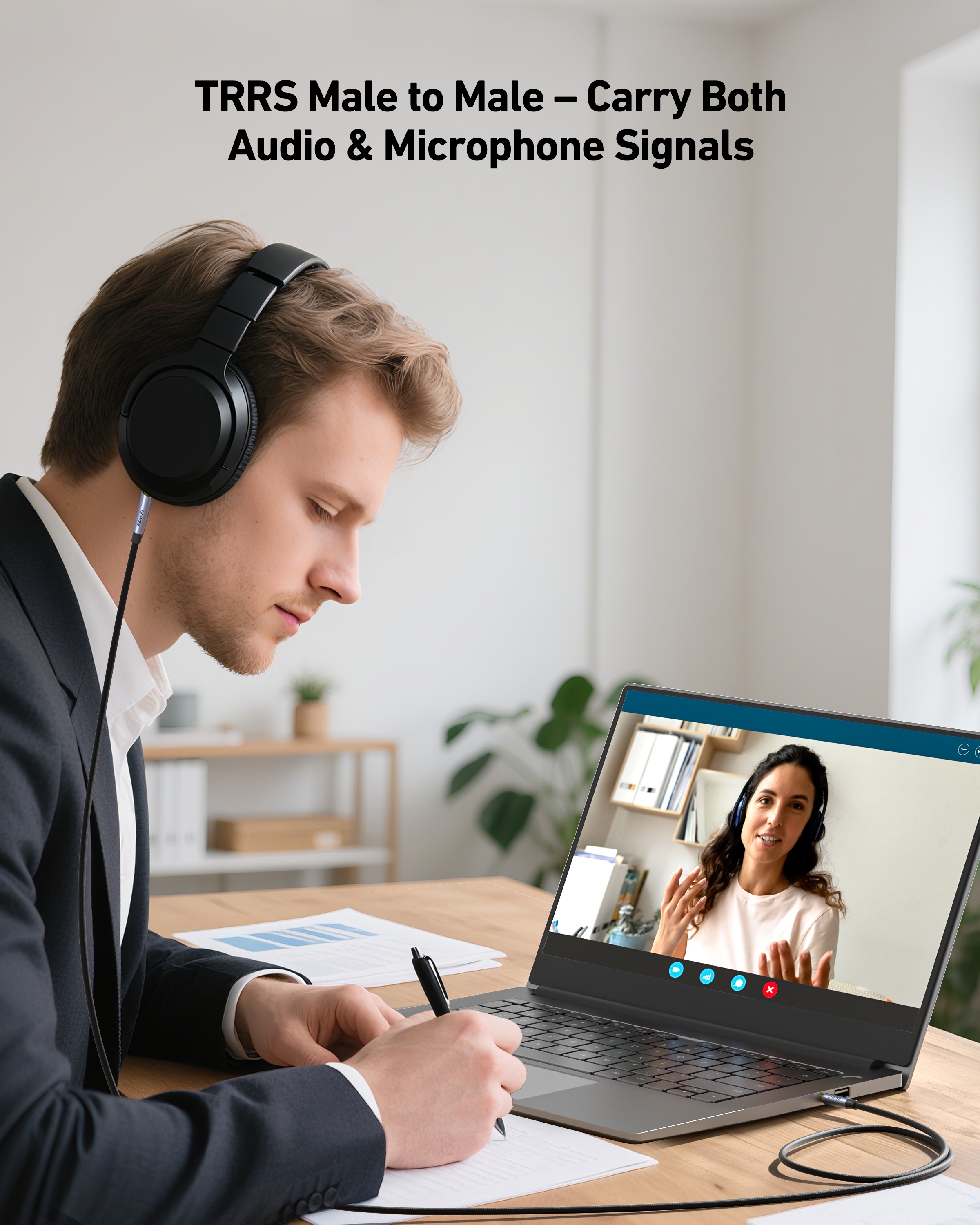 This audio cable features a 3.5mm TRRS male to male connection, supporting stereo audio and microphone signals. It is suitable for use with gaming headsets, smartphones, recording devices, and other audio interfaces, providing reliable and high-quality sound transmission.
