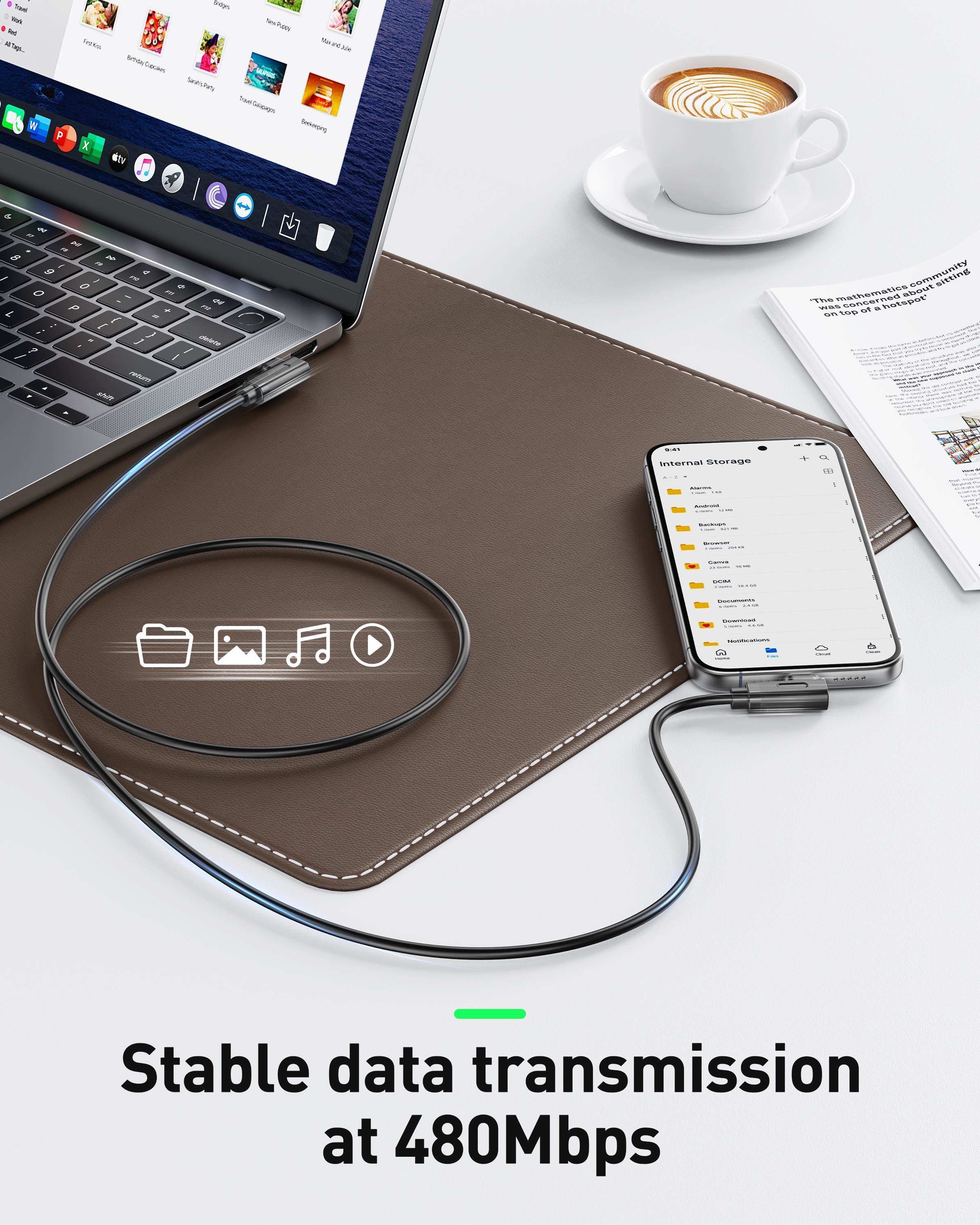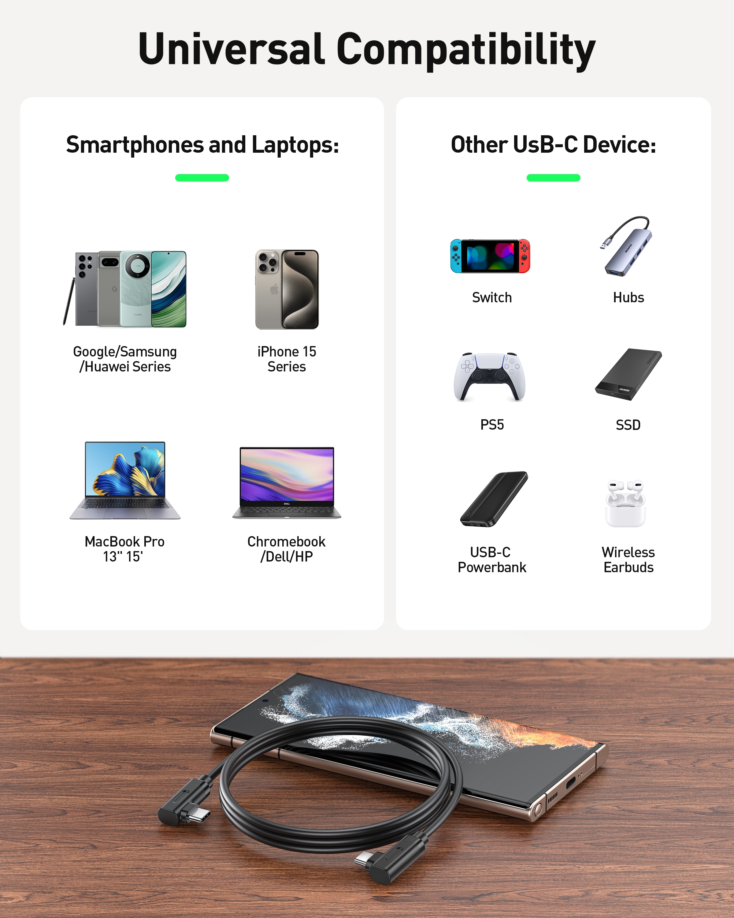 This right-angle USB C cable is designed to provide a convenient and durable connection for charging and data transfer. Its dual 90-degree connectors help save space and reduce strain on device ports, making it suitable for gaming, in-car charging, and bedside use.