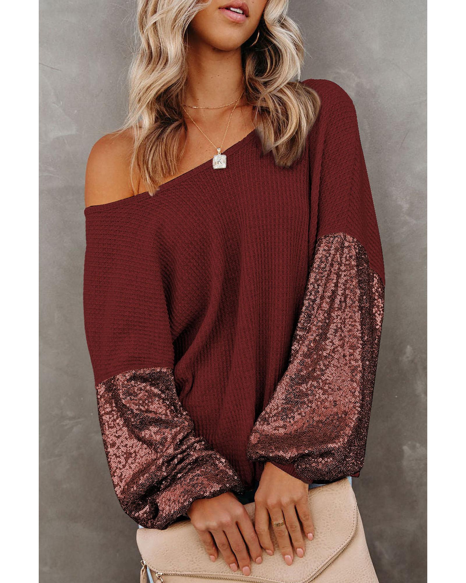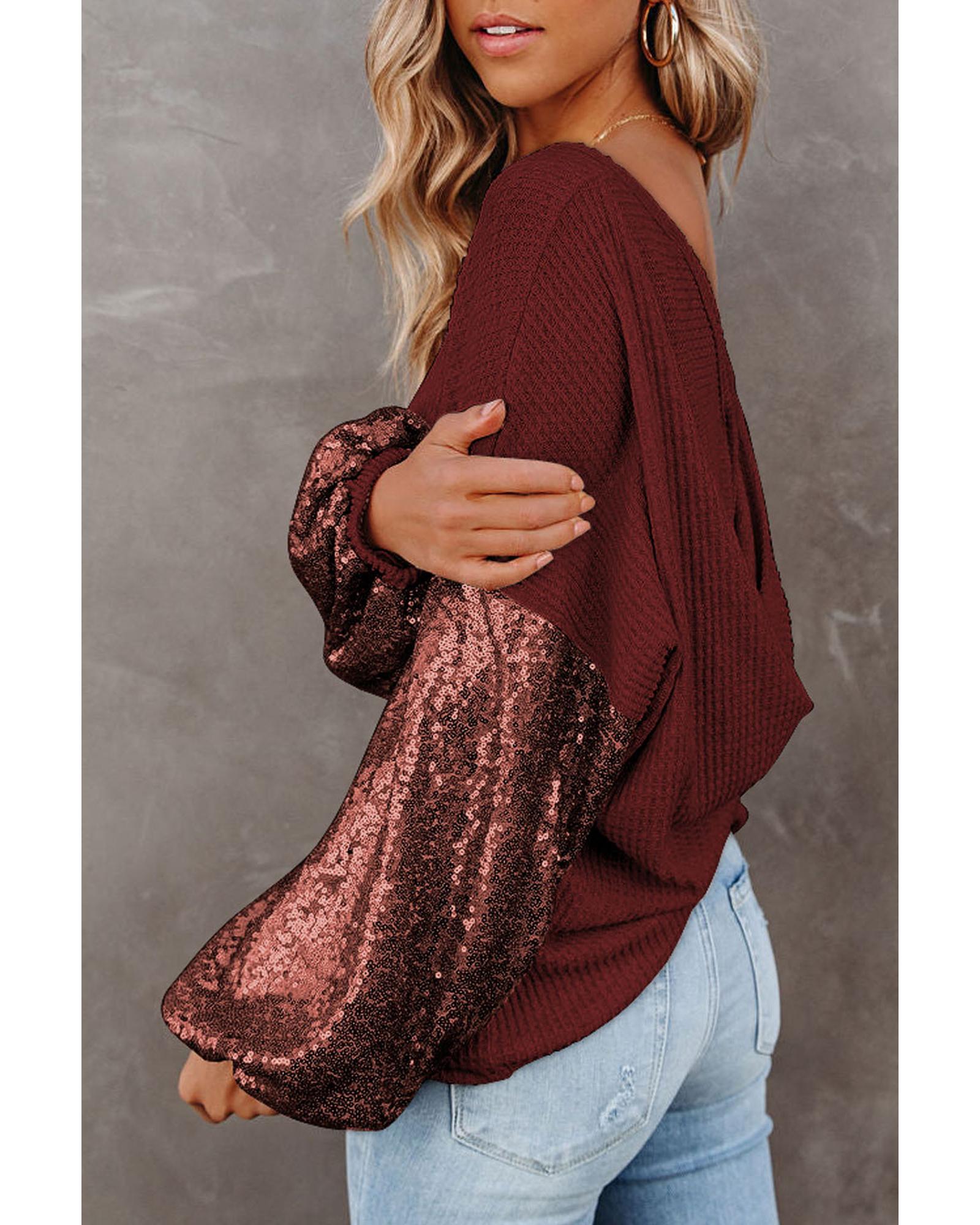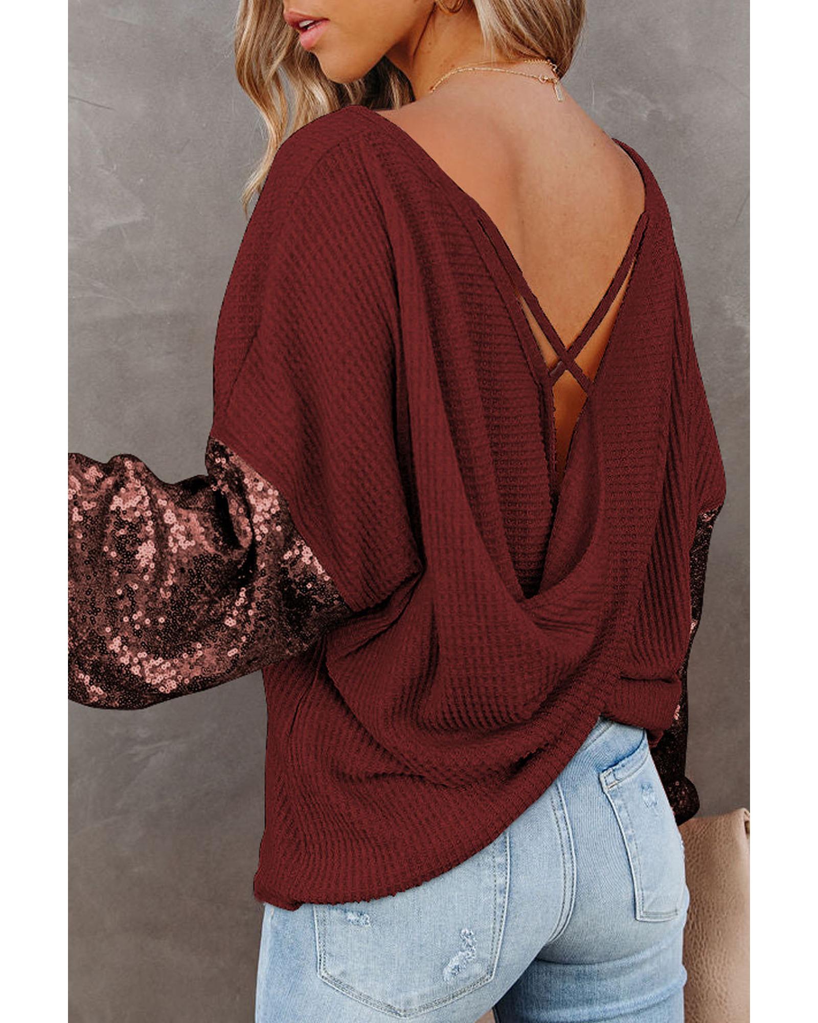 Biking Red Sequin Patchwork Sleeve Open Back Waffle Knit Top – M