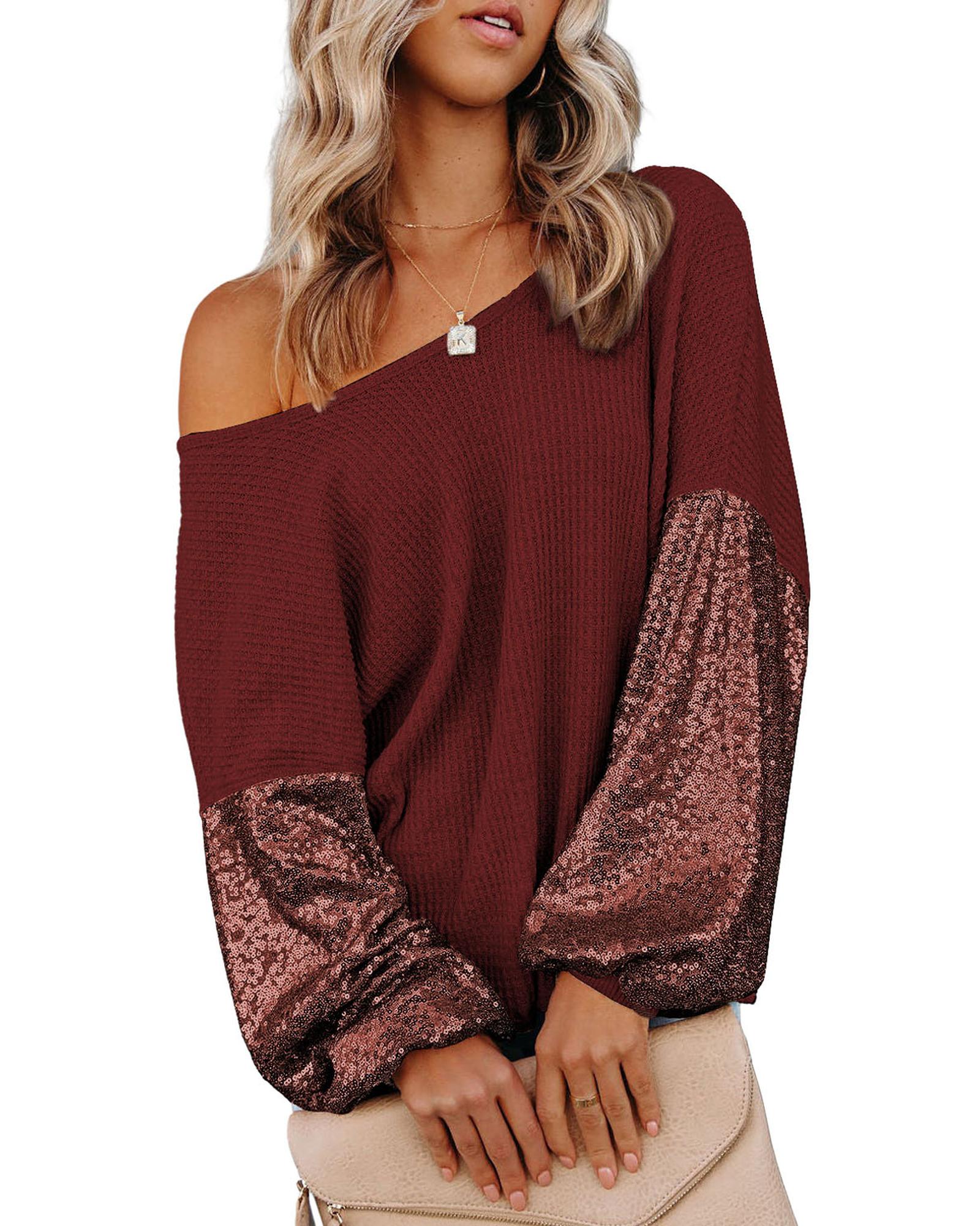 This stylish top features a trendy fitted design with a unique patchwork sleeve and an open back detail. Made from comfortable waffle knit fabric, it is perfect for a night out and suitable for fall and autumn seasons. The off-shoulder collar adds an elegant touch, making it ideal for women seeking a fashionable and chic look.