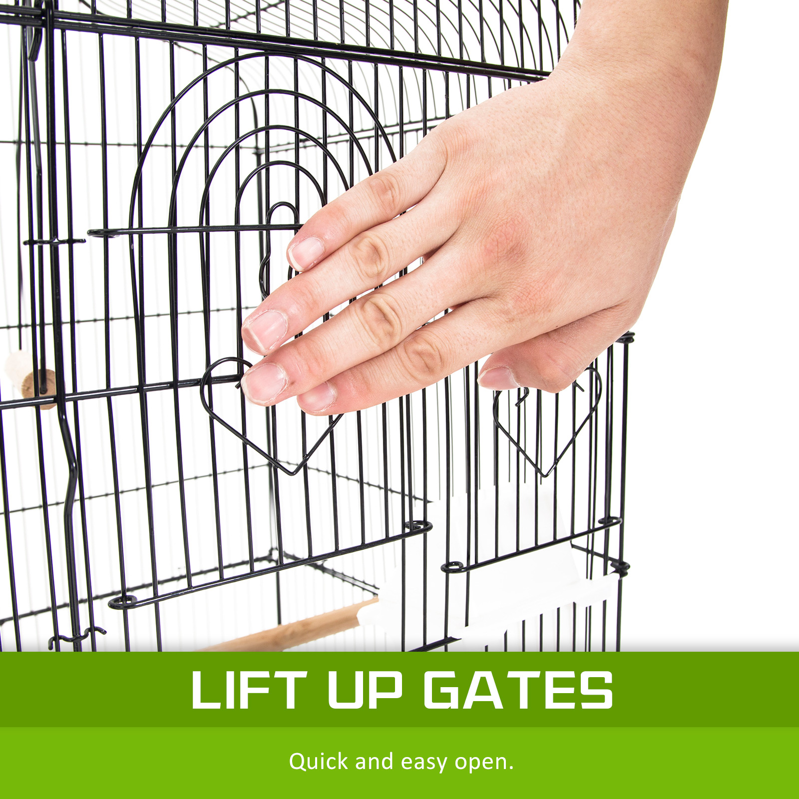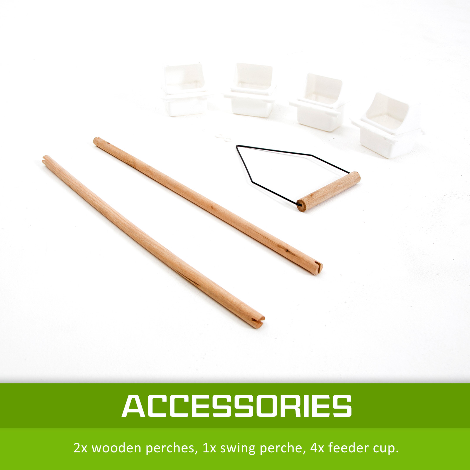 • Includes two wooden perches and one swing perch