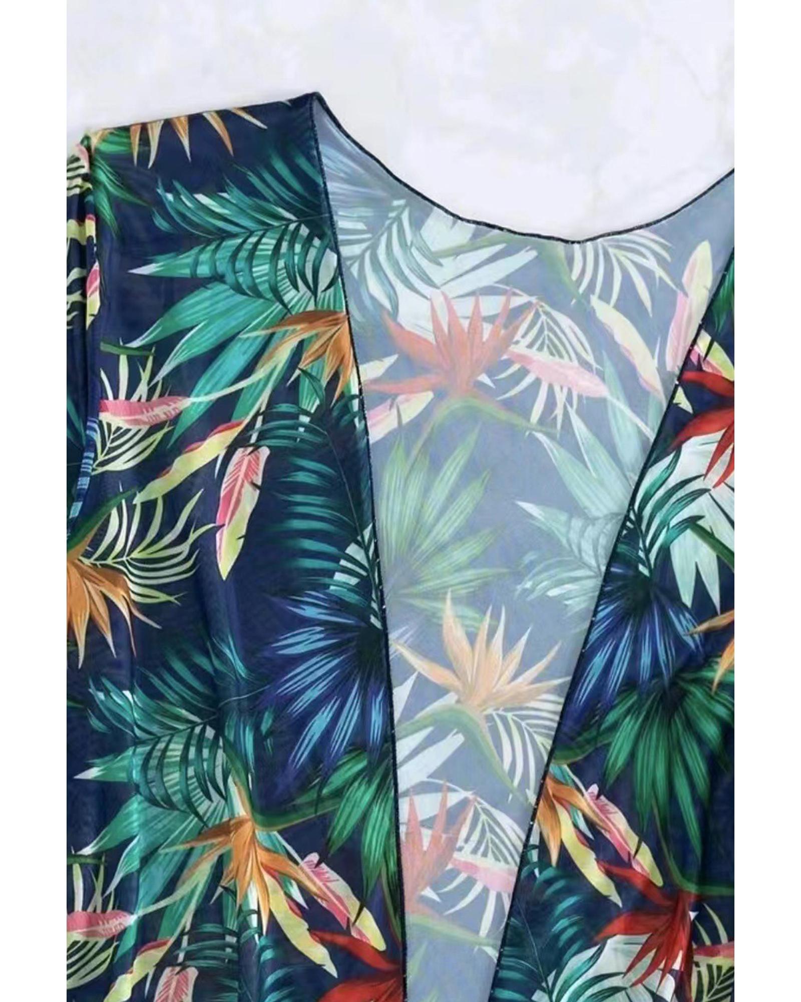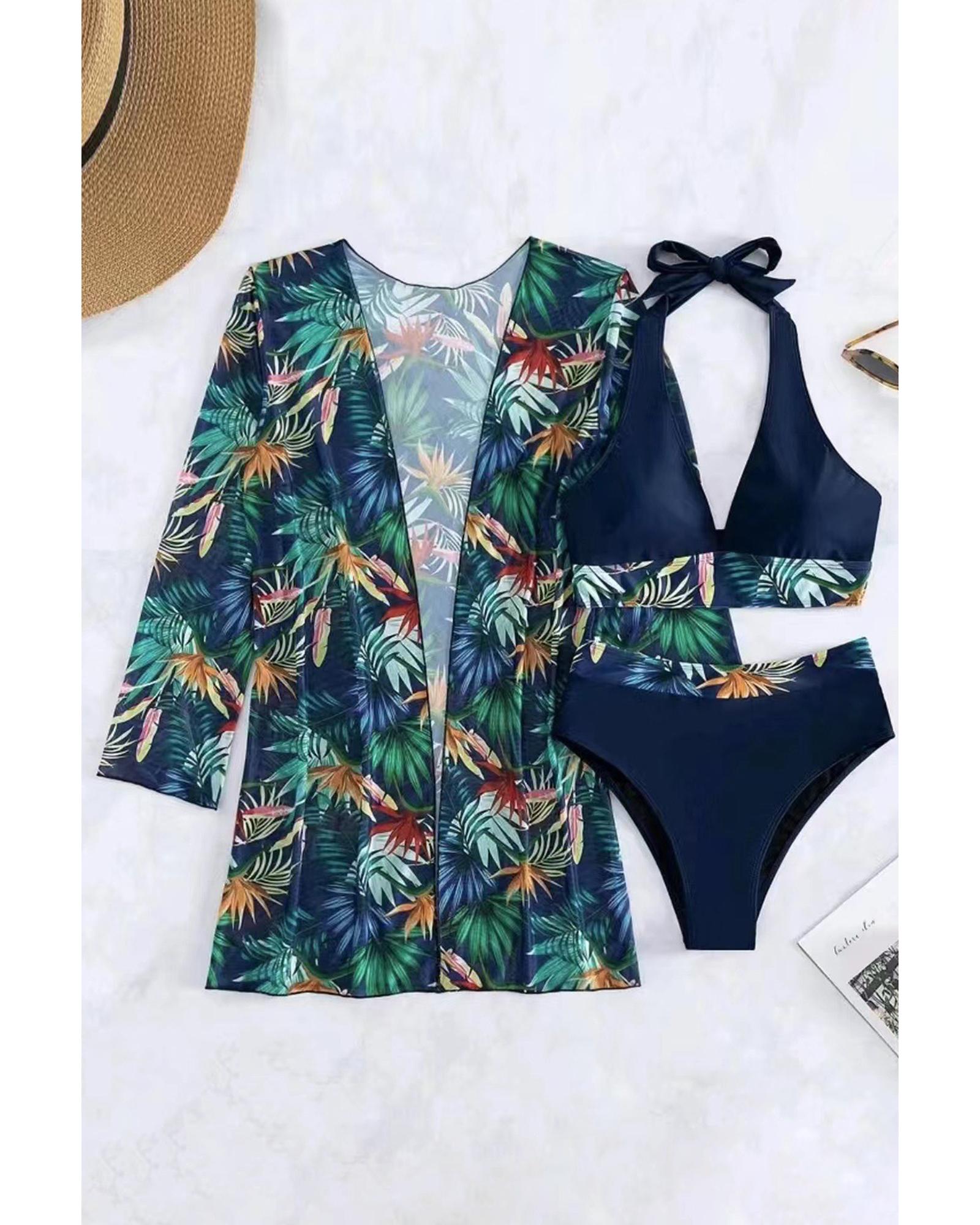This set includes three pieces featuring a vibrant tropical print with contrast trim details, offering a stylish and modern look. The halter neck design provides lift and support, making it suitable for various beach or poolside occasions. Designed with a trendy fitted style, it follows international sizing standards to help you find the perfect fit.