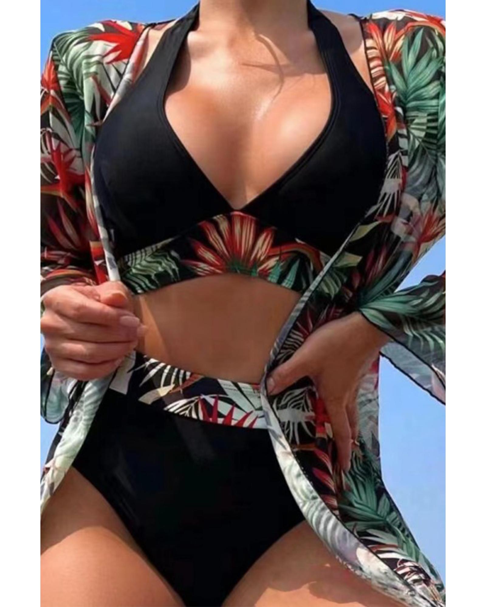 Black 3pcs Tropical Contrast Trim Halter Bikini Set with Cover up – S