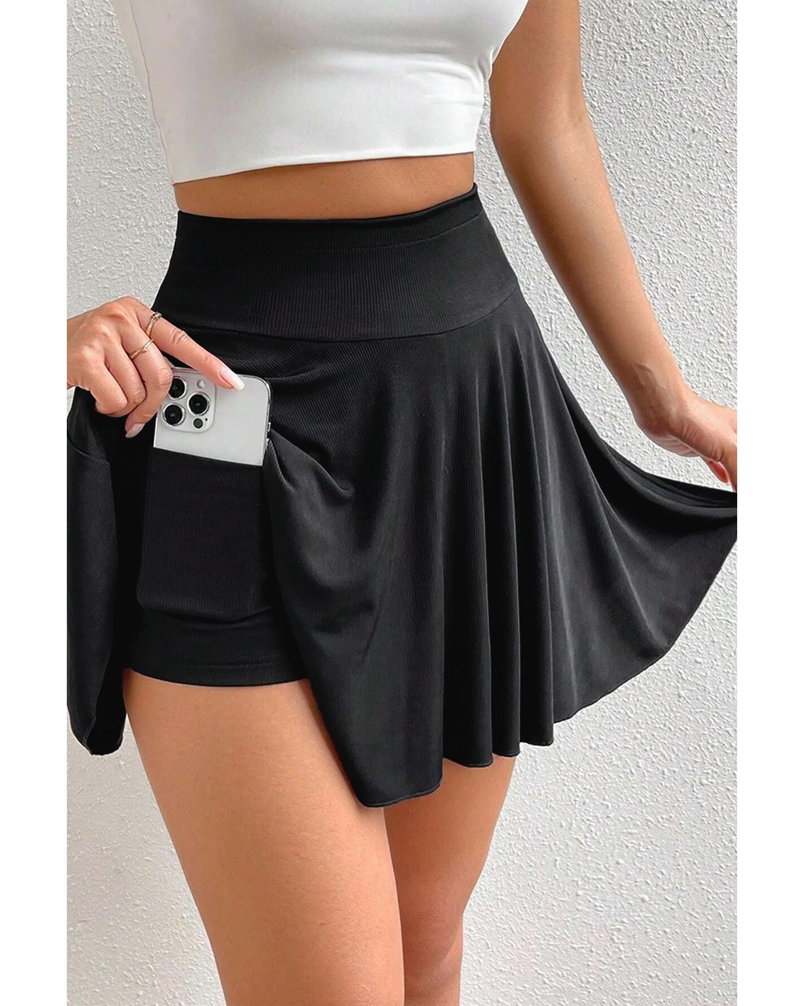 This high-waist skort features a draped, A-line silhouette that offers a flattering and elegant look. It is designed with a trendy fitted style, providing both comfort and style for everyday wear. The skort includes a convenient phone pocket, making it practical for on-the-go use. Made from a soft, stretchy fabric blend, it ensures a comfortable fit while maintaining its shape.